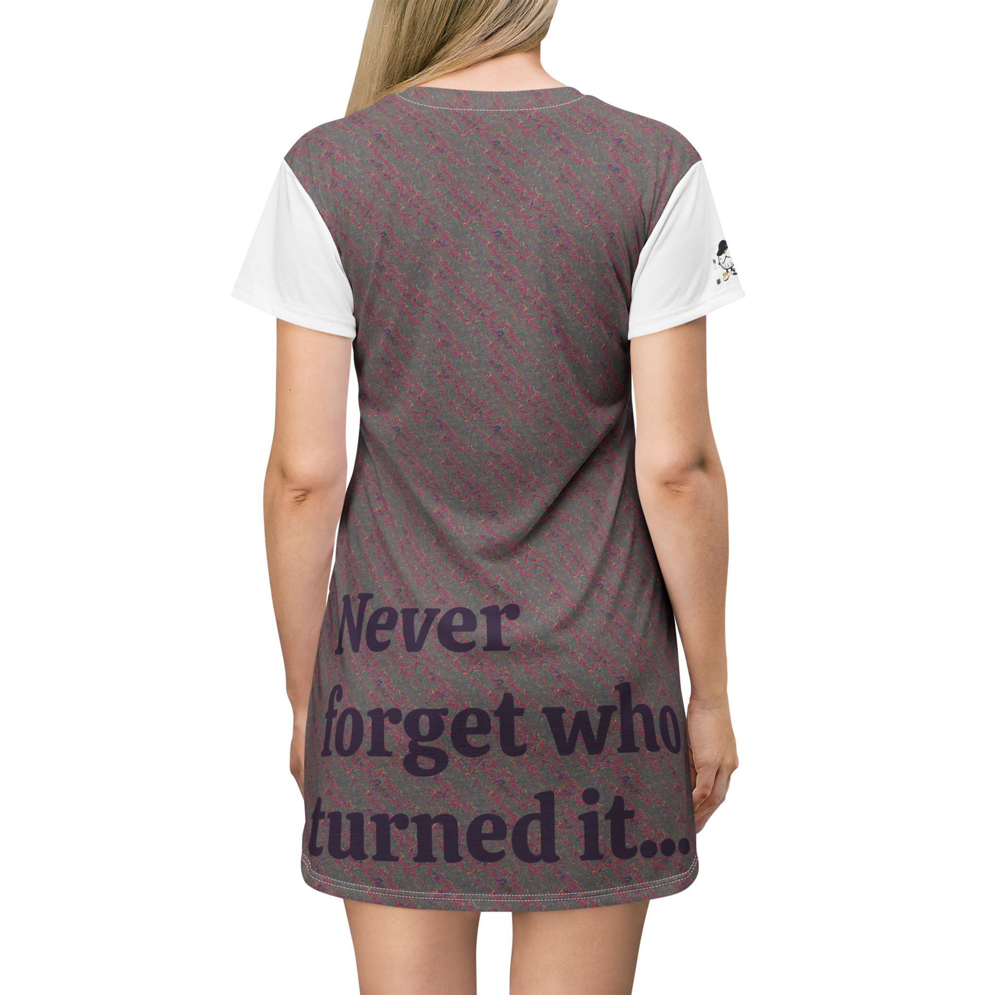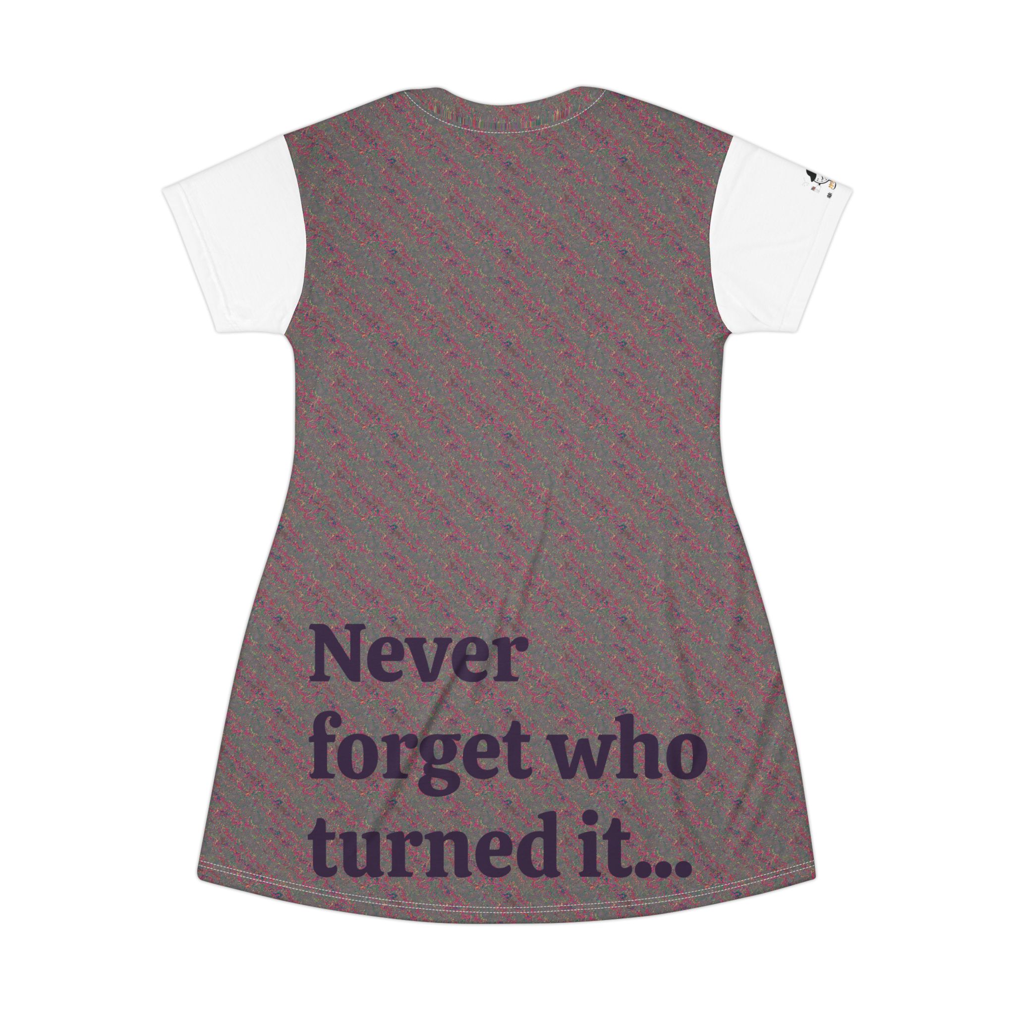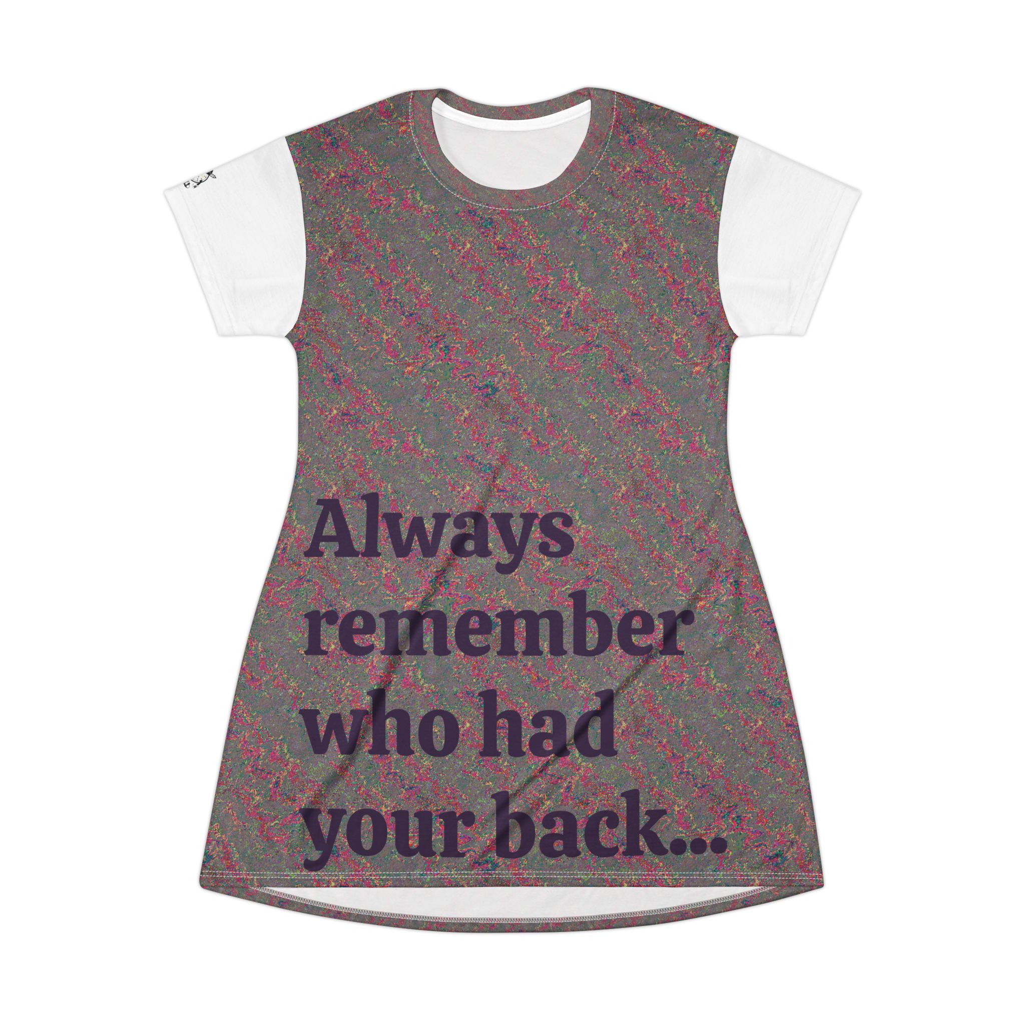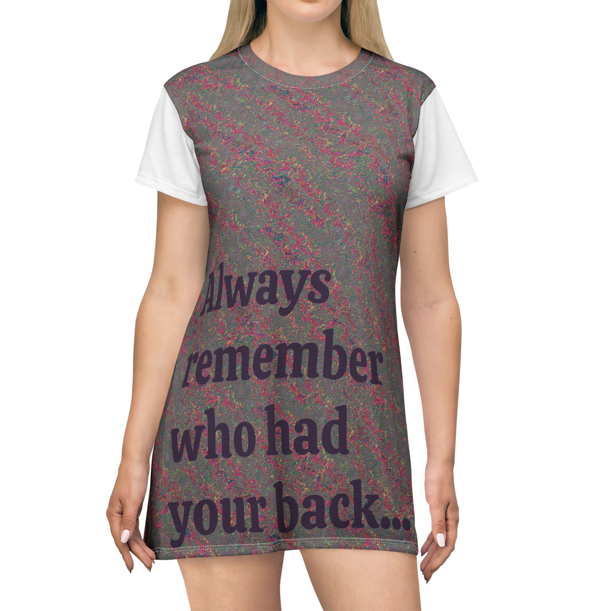 A soft, breathable dress that reads like a quiet declaration. This lightweight polyester dress drapes easily and moves with you, printed all-over with a subtle textured pattern and bold, thoughtful text on front and back: “Always remember who had your back…” and “Never forget who turned it…”. The A-line cut and short sleeves create a relaxed silhouette that feels casual and intentional. Tagless and finished with self-fabric binding and side seams for structure, it keeps its shape and color wash after wash. Wear it layered over leggings for late-night conversations, or alone when you want your outfit to speak for you.