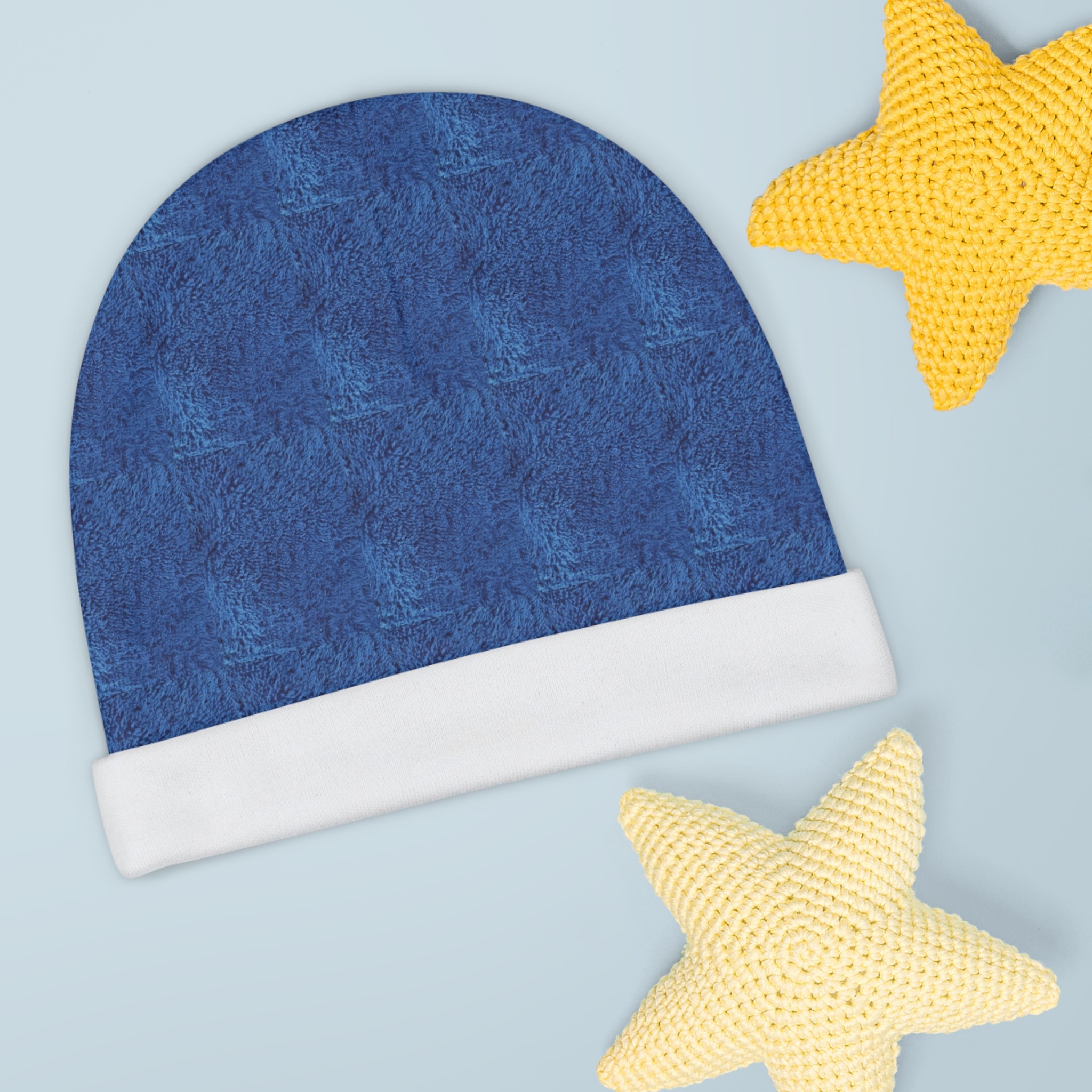 Softly textured navy-blue baby beanie designed to sit snugly and comfortably on a newborn’s head. The subtle, mottled pattern creates a cozy, hand-knitted look while remaining lightweight and quick-drying. Breathable interlock knit gives gentle stretch so the hat slips on easily and holds shape through washes and wear. With the same design printed on both sides, it looks finished from every angle — a small, wearable detail that adds everyday warmth and style for those first outings, naps, and morning cuddles.