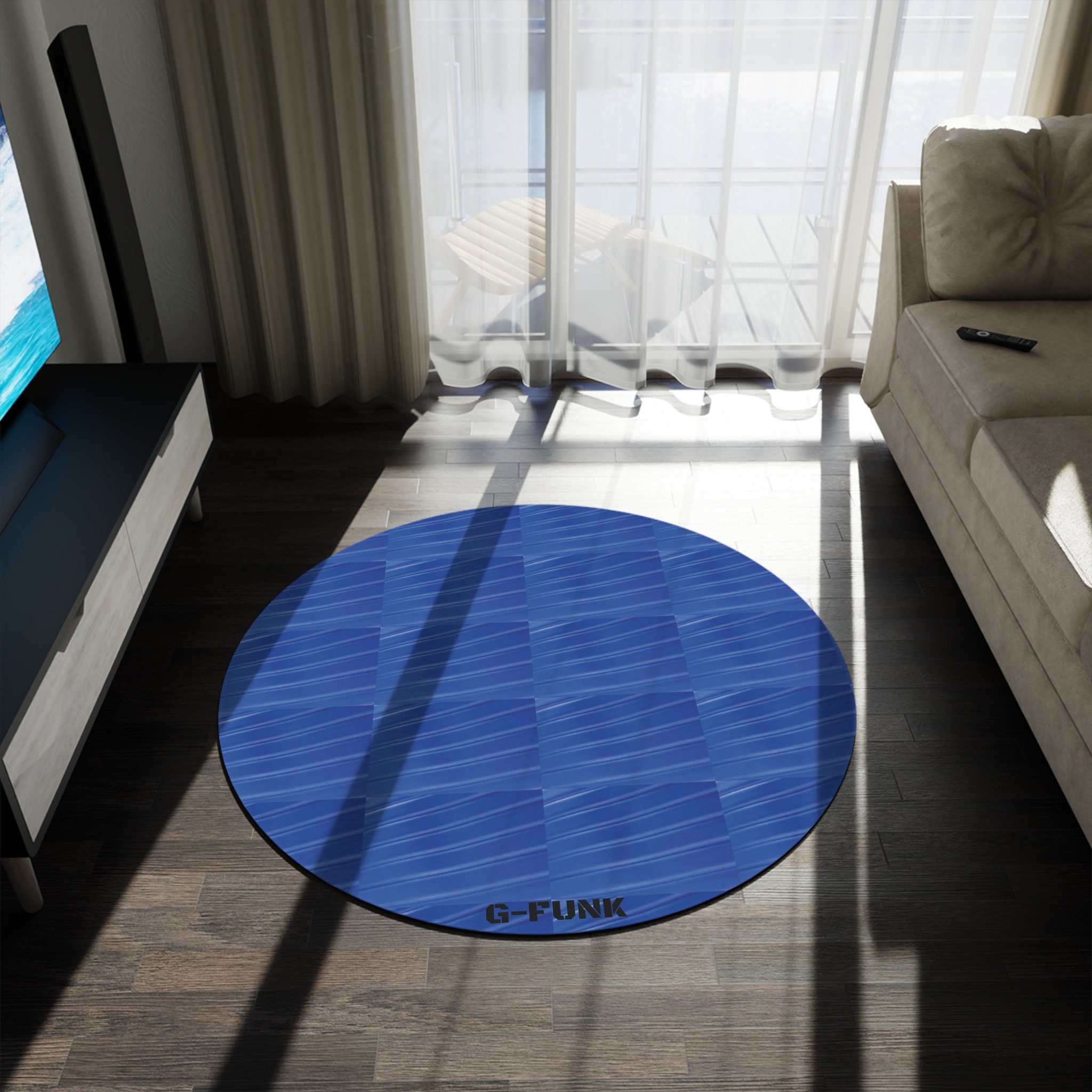 A lush round chenille rug that brings calm, contemporary style to floors and lounging nooks. The deep blue patterned top has a subtle geometric weave and a soft, plush pile that invites bare feet and long stretches. Finished with neat hemmed edges and a durable textured face, it holds vibrant printed color while resisting pilling and wrinkles. The back offers a neutral, grippy surface to keep the rug settled underfoot. Use it to anchor a cozy reading corner, add a touch of color to a minimalist living room, or layer under a low coffee table for relaxed weekend mornings.