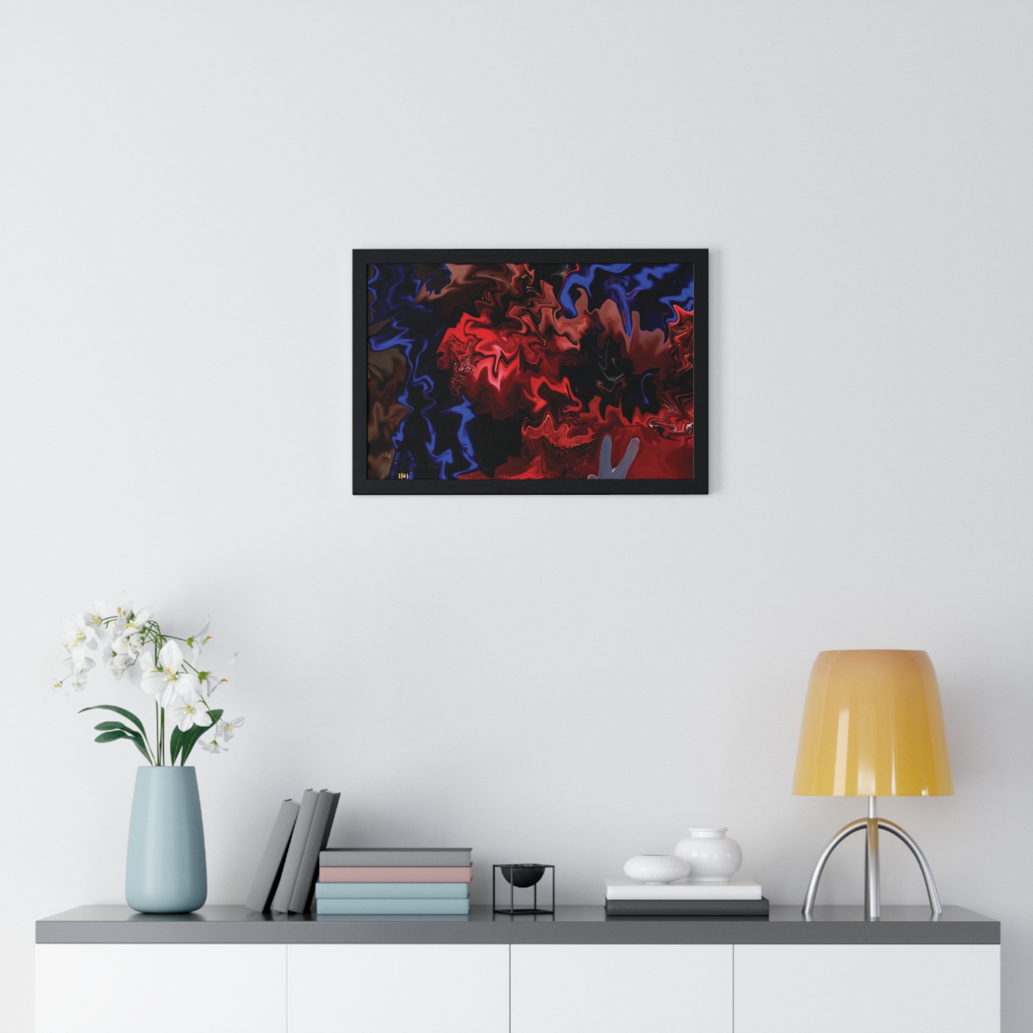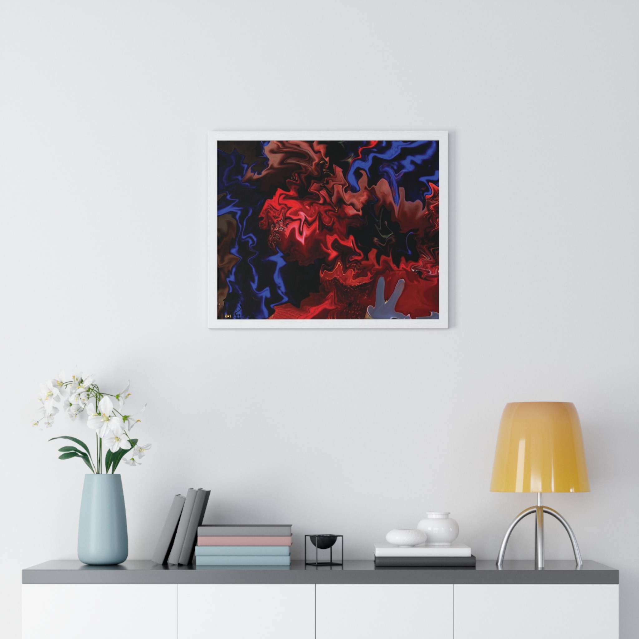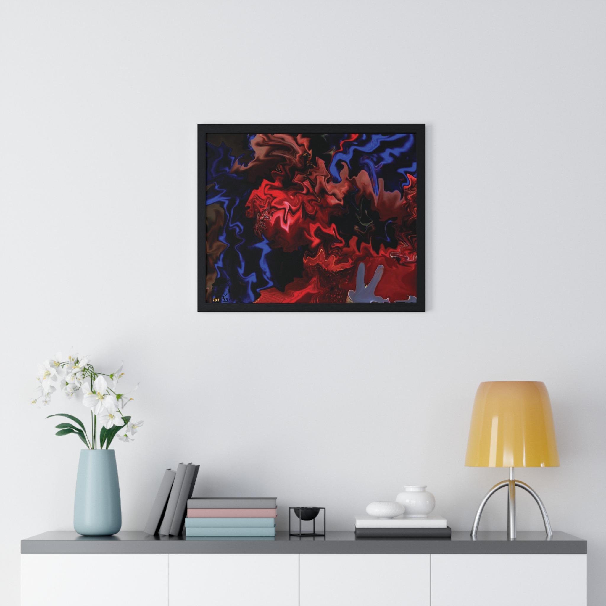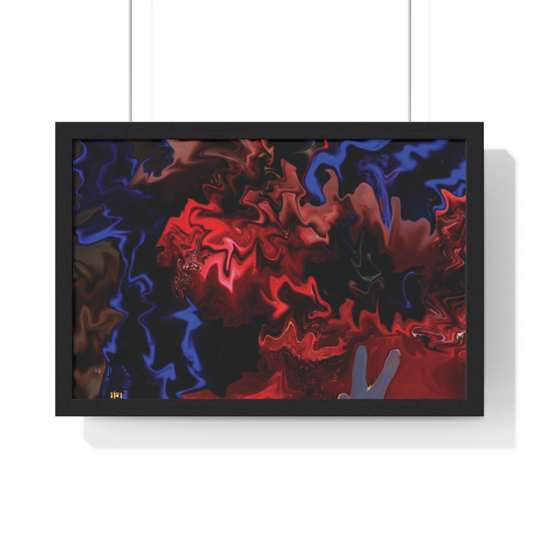This horizontal framed poster brings a pulse of abstract motion into a living space. Deep reds and electric blues swirl across museum-grade matte paper, printed with vivid pigment inks that hold their intensity over time. The slim wooden frame (black or white) and plexiglass front create a gallery-ready silhouette, while pre-installed hanging hardware means it’s ready to display the moment it arrives. Sized for tabletop groupings or a statement above a console, the piece reads as modern, intense, and quietly cinematic — an artwork that shifts the mood of a room from ordinary to charged without overpowering it.