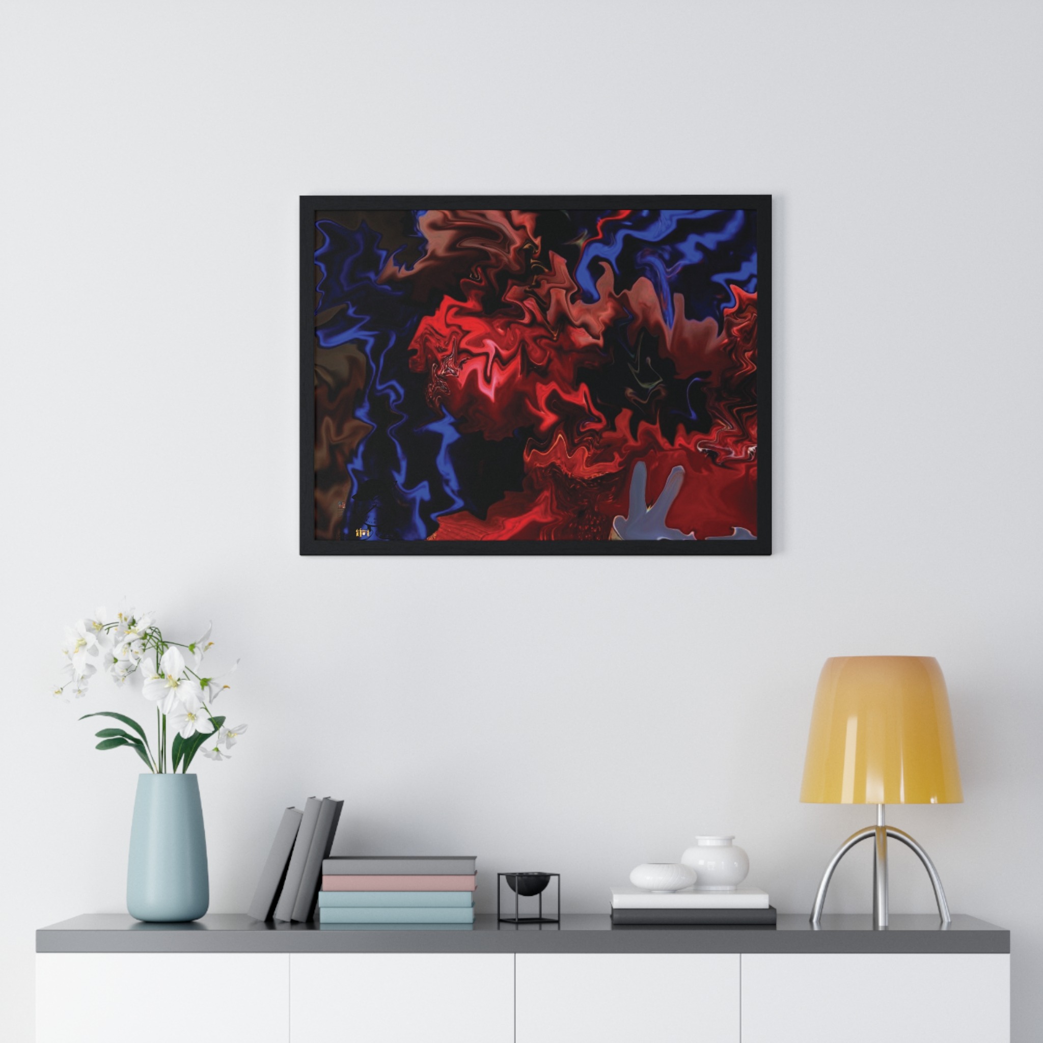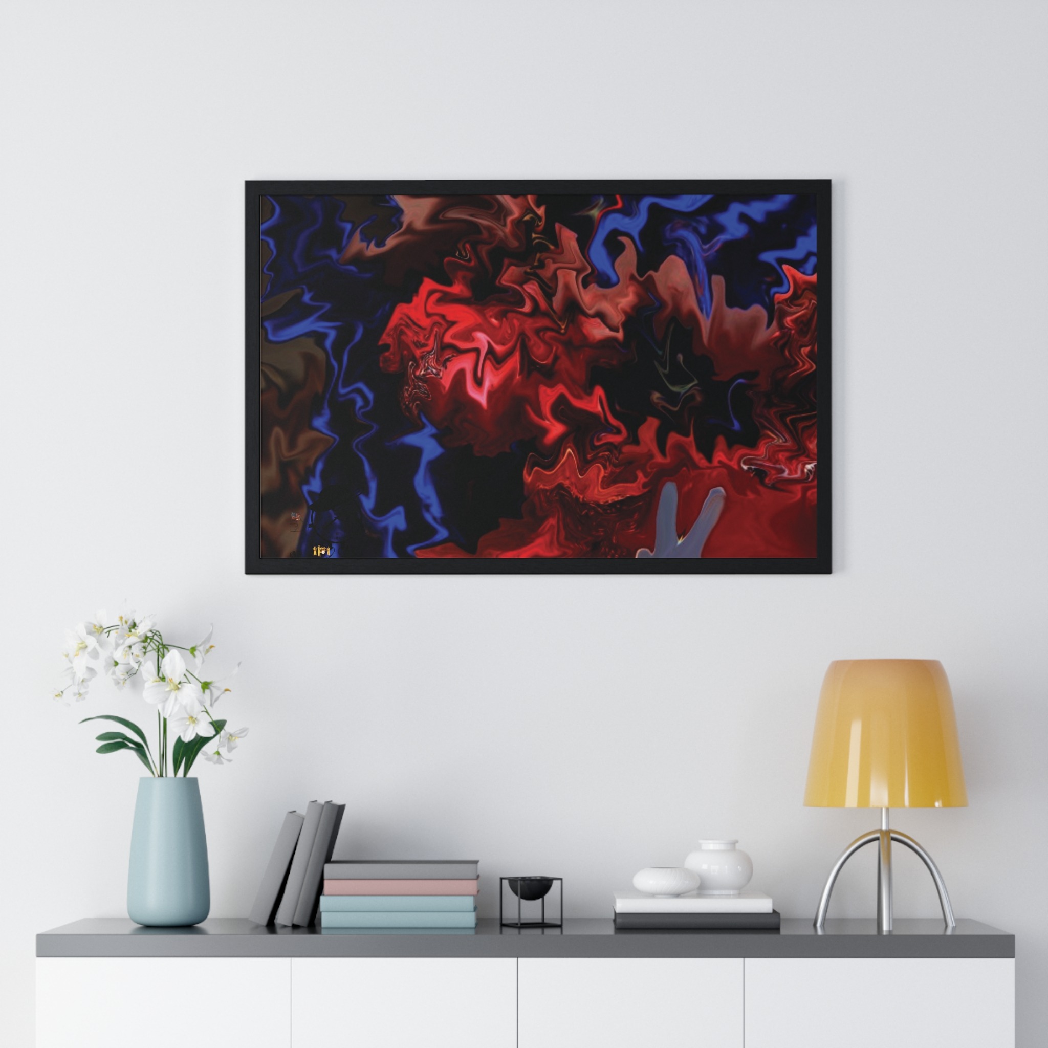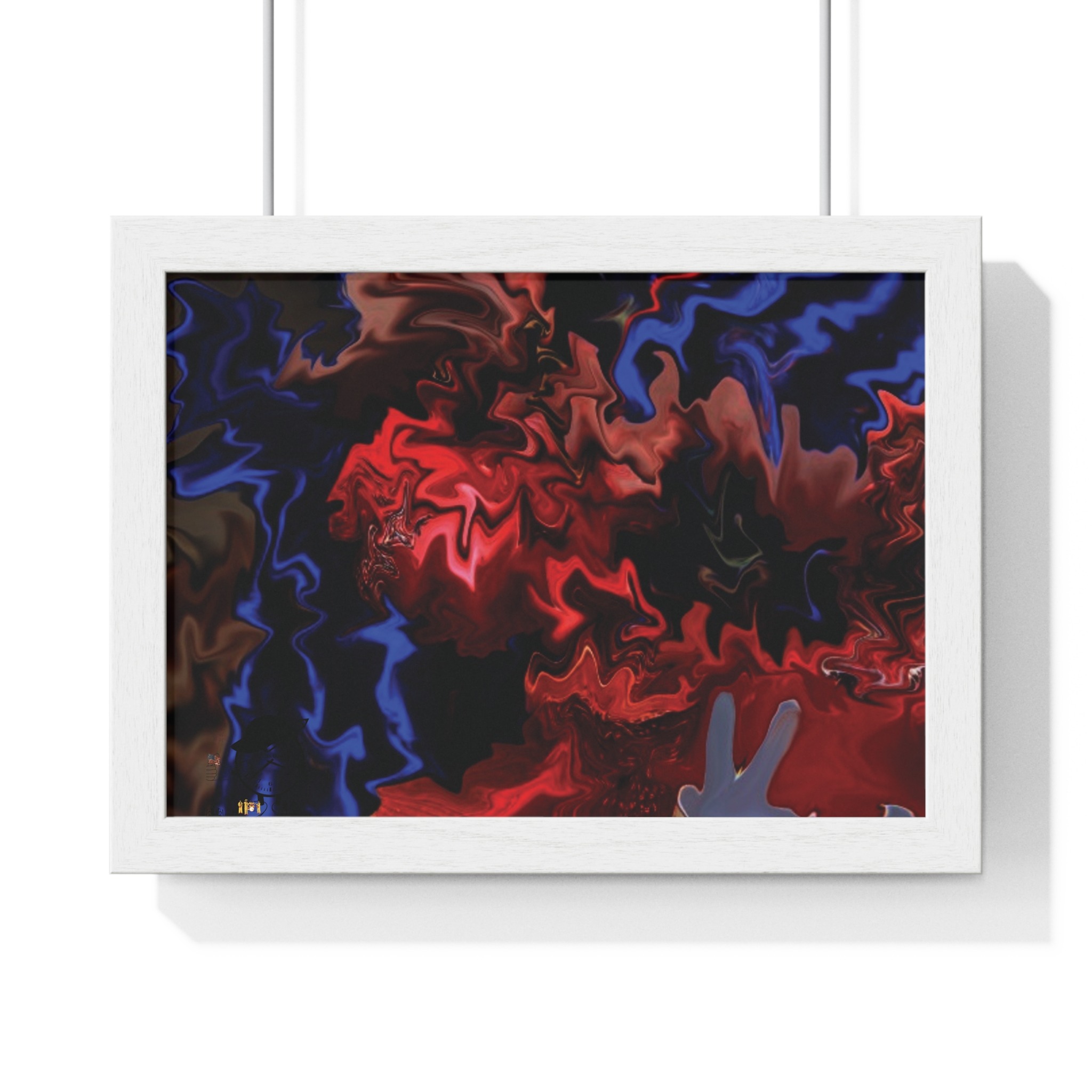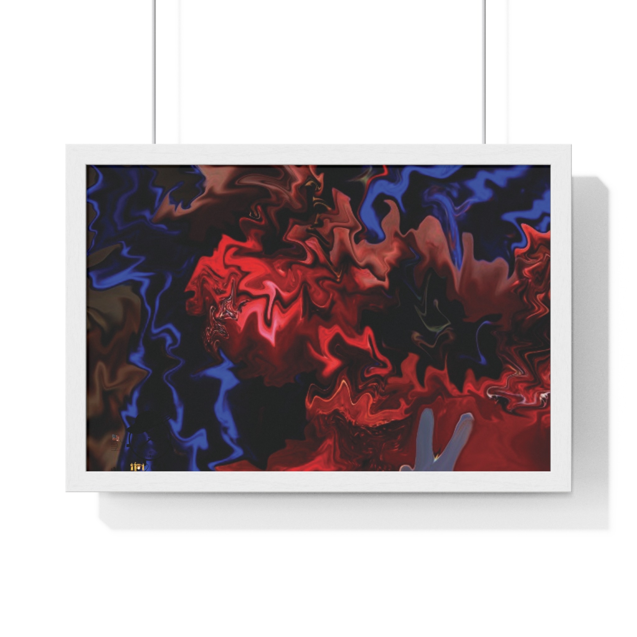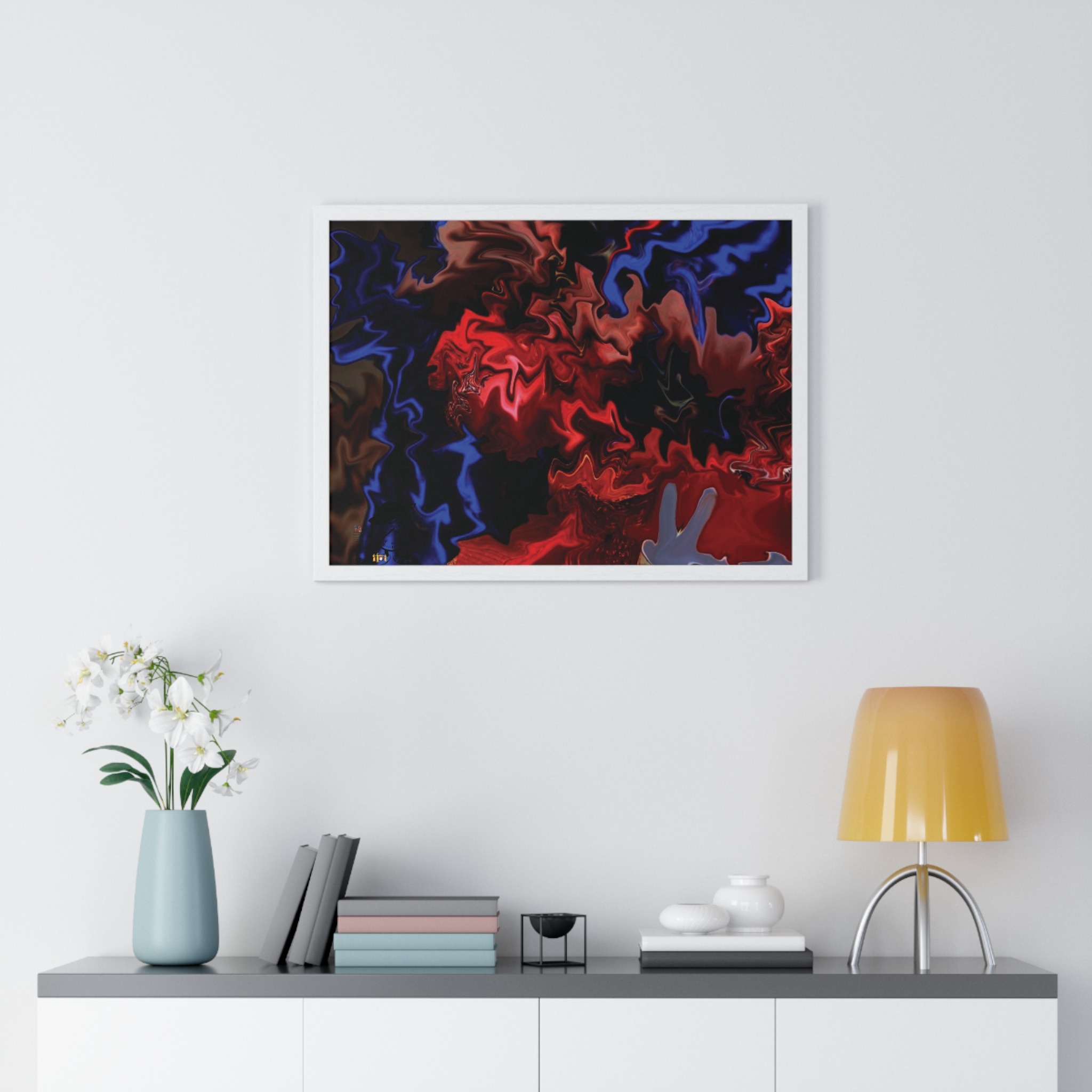 This horizontal framed poster brings a pulse of abstract motion into a living space. Deep reds and electric blues swirl across museum-grade matte paper, printed with vivid pigment inks that hold their intensity over time. The slim wooden frame (black or white) and plexiglass front create a gallery-ready silhouette, while pre-installed hanging hardware means it’s ready to display the moment it arrives. Sized for tabletop groupings or a statement above a console, the piece reads as modern, intense, and quietly cinematic — an artwork that shifts the mood of a room from ordinary to charged without overpowering it.
