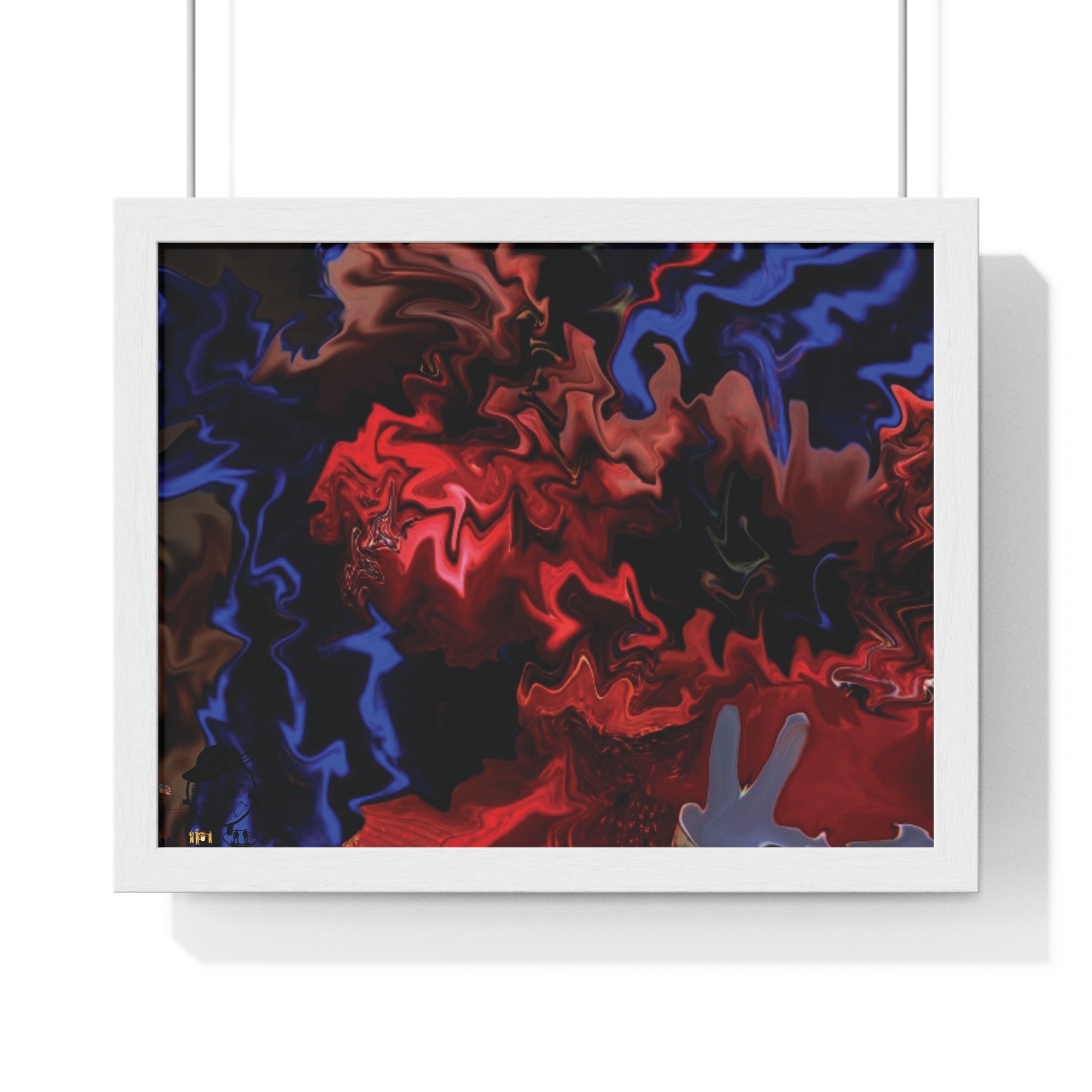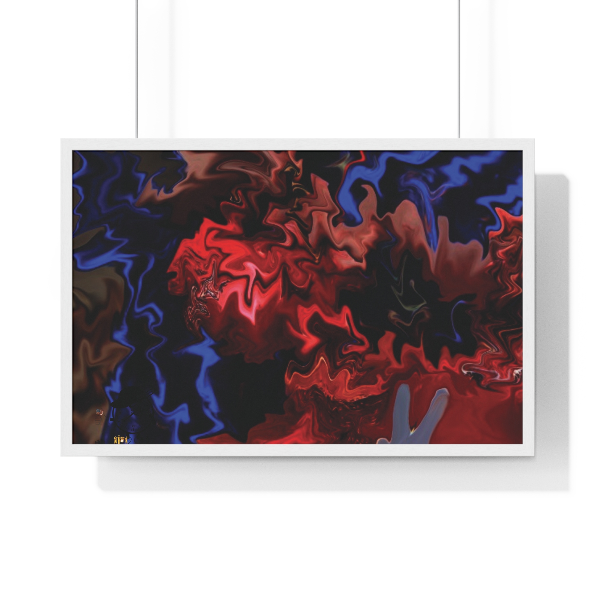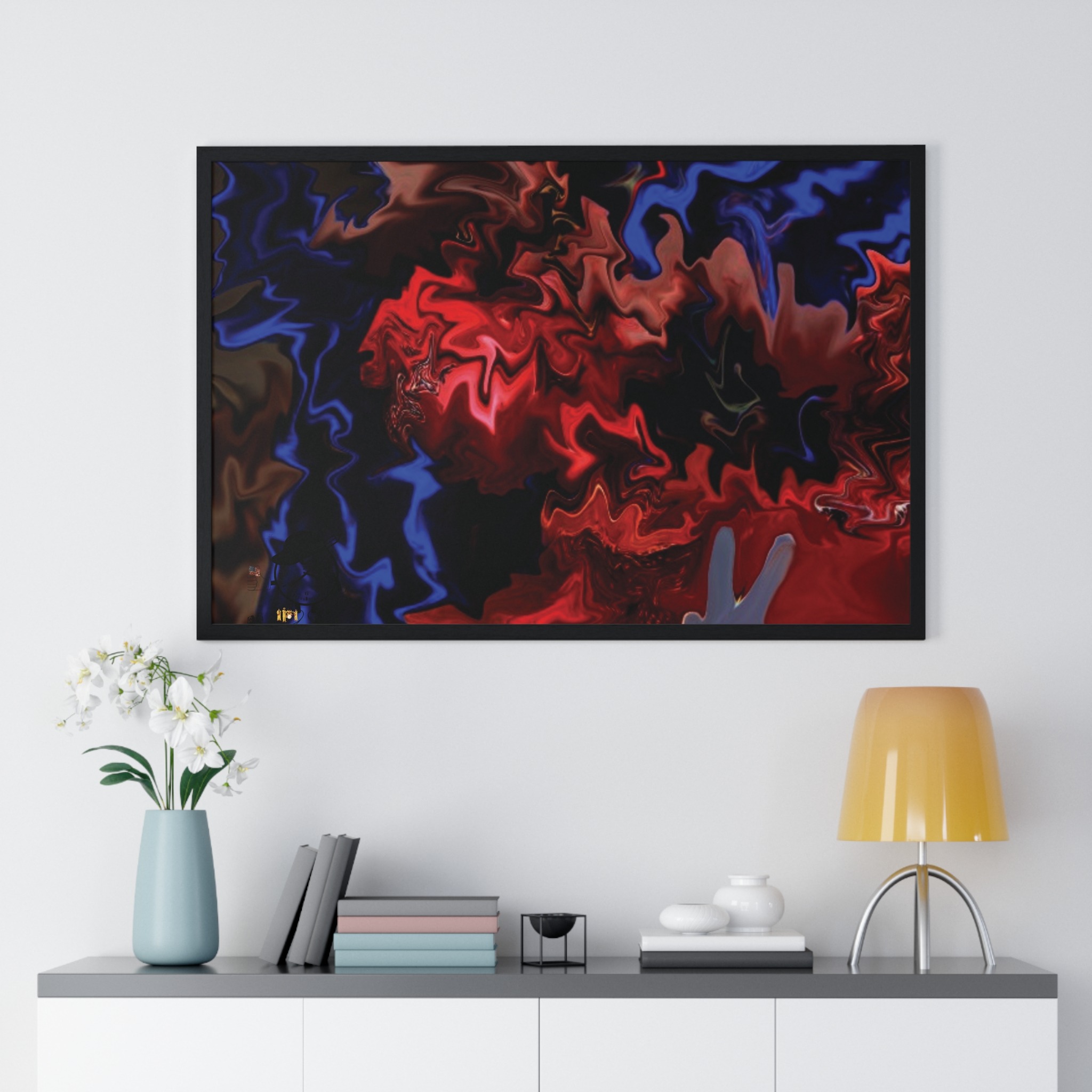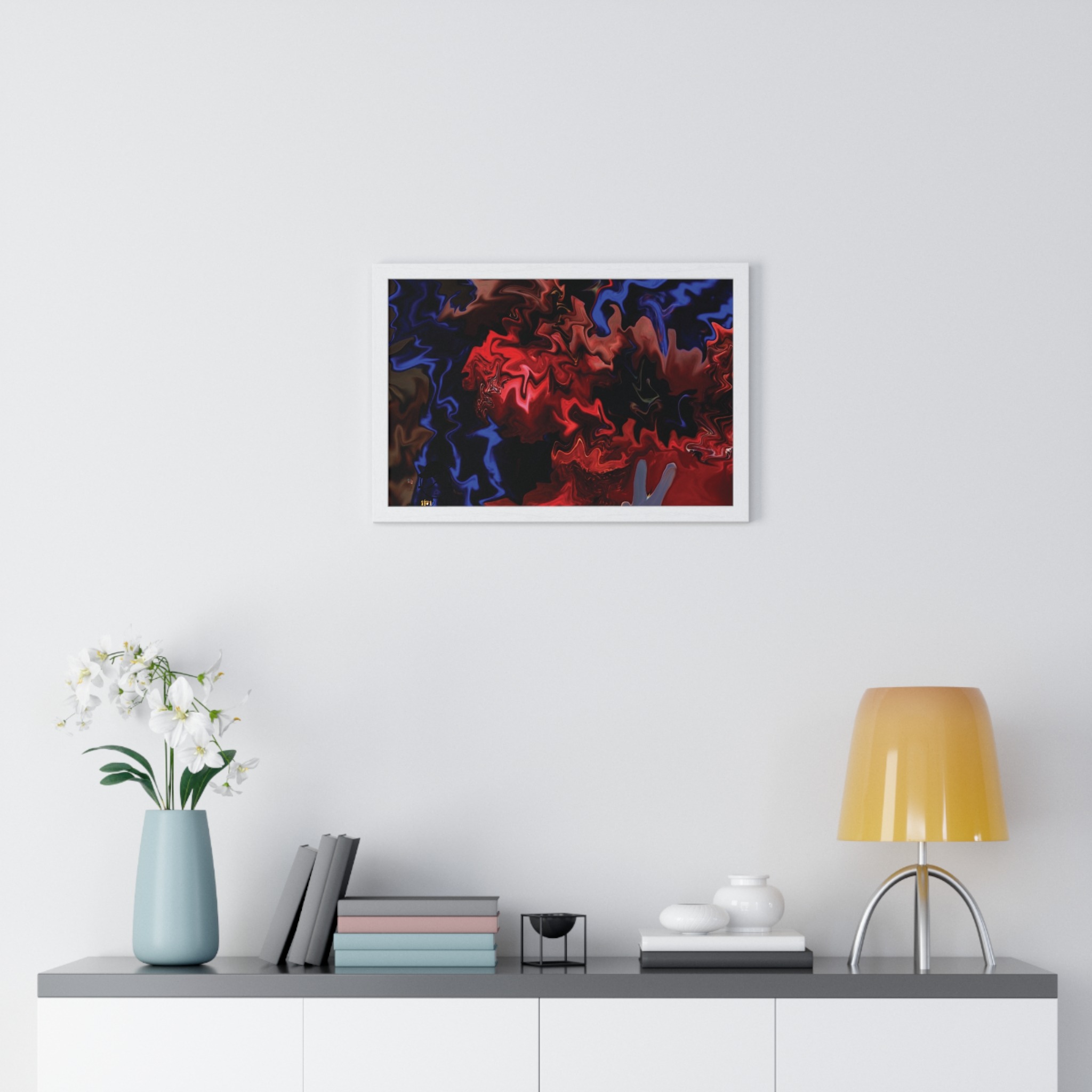 This horizontal framed poster brings a pulse of abstract motion into a living space. Deep reds and electric blues swirl across museum-grade matte paper, printed with vivid pigment inks that hold their intensity over time. The slim wooden frame (black or white) and plexiglass front create a gallery-ready silhouette, while pre-installed hanging hardware means it’s ready to display the moment it arrives. Sized for tabletop groupings or a statement above a console, the piece reads as modern, intense, and quietly cinematic — an artwork that shifts the mood of a room from ordinary to charged without overpowering it.