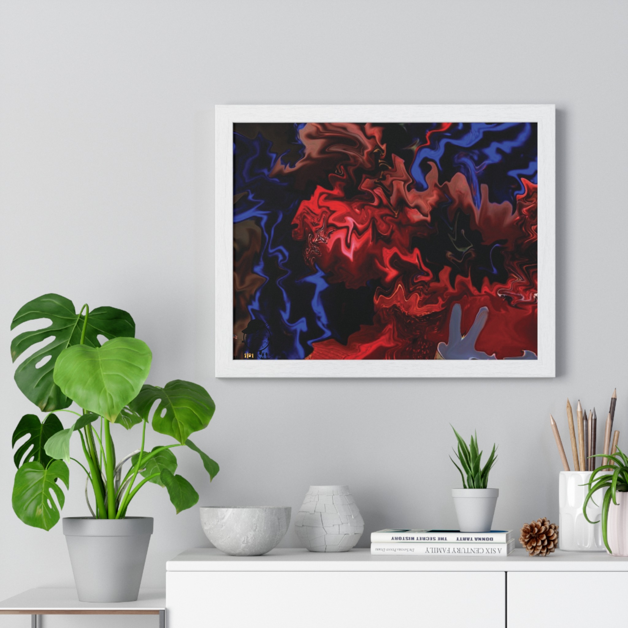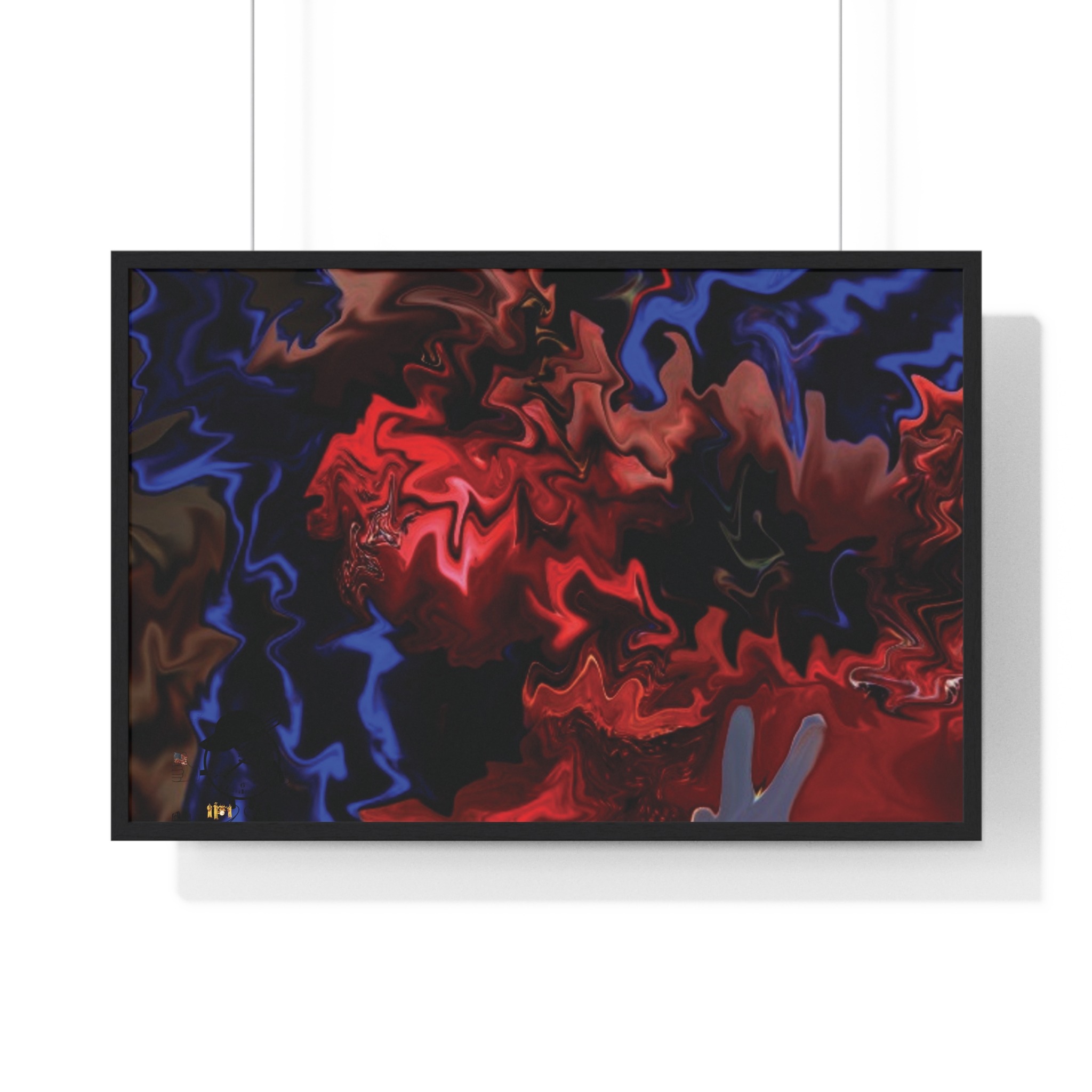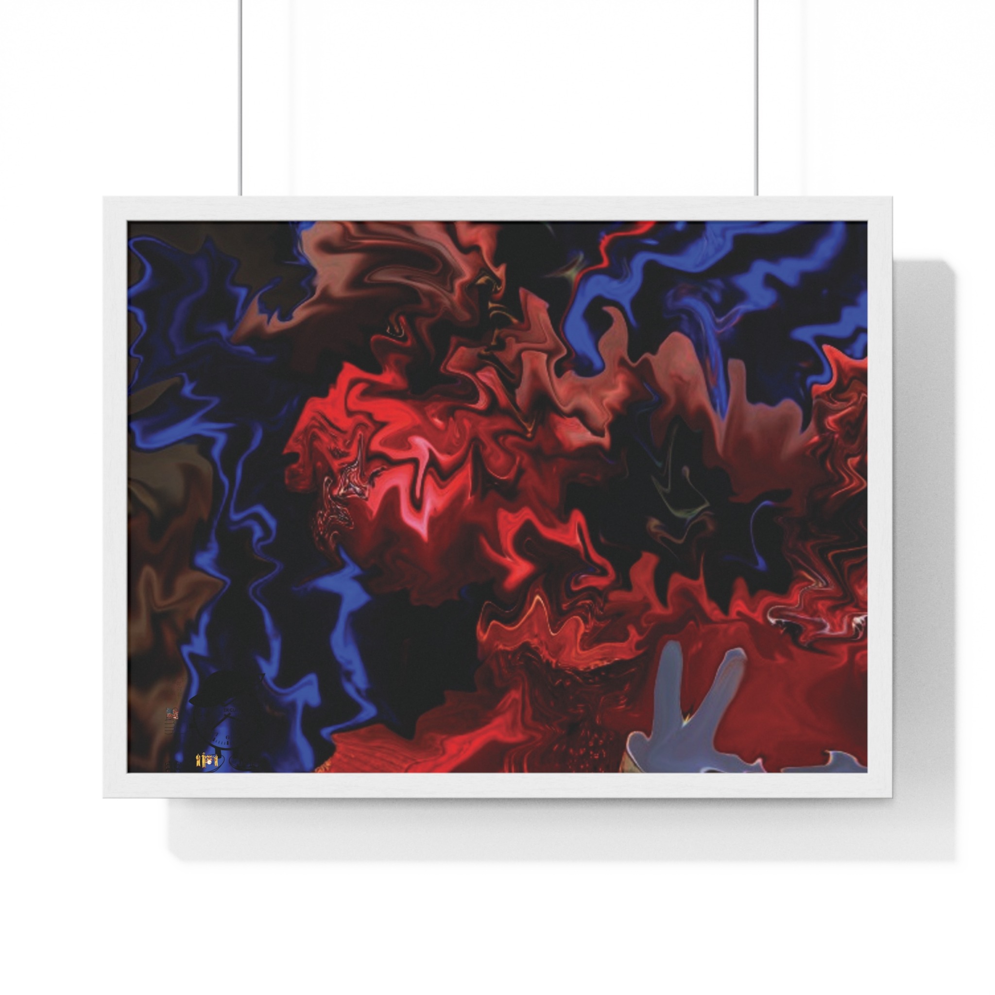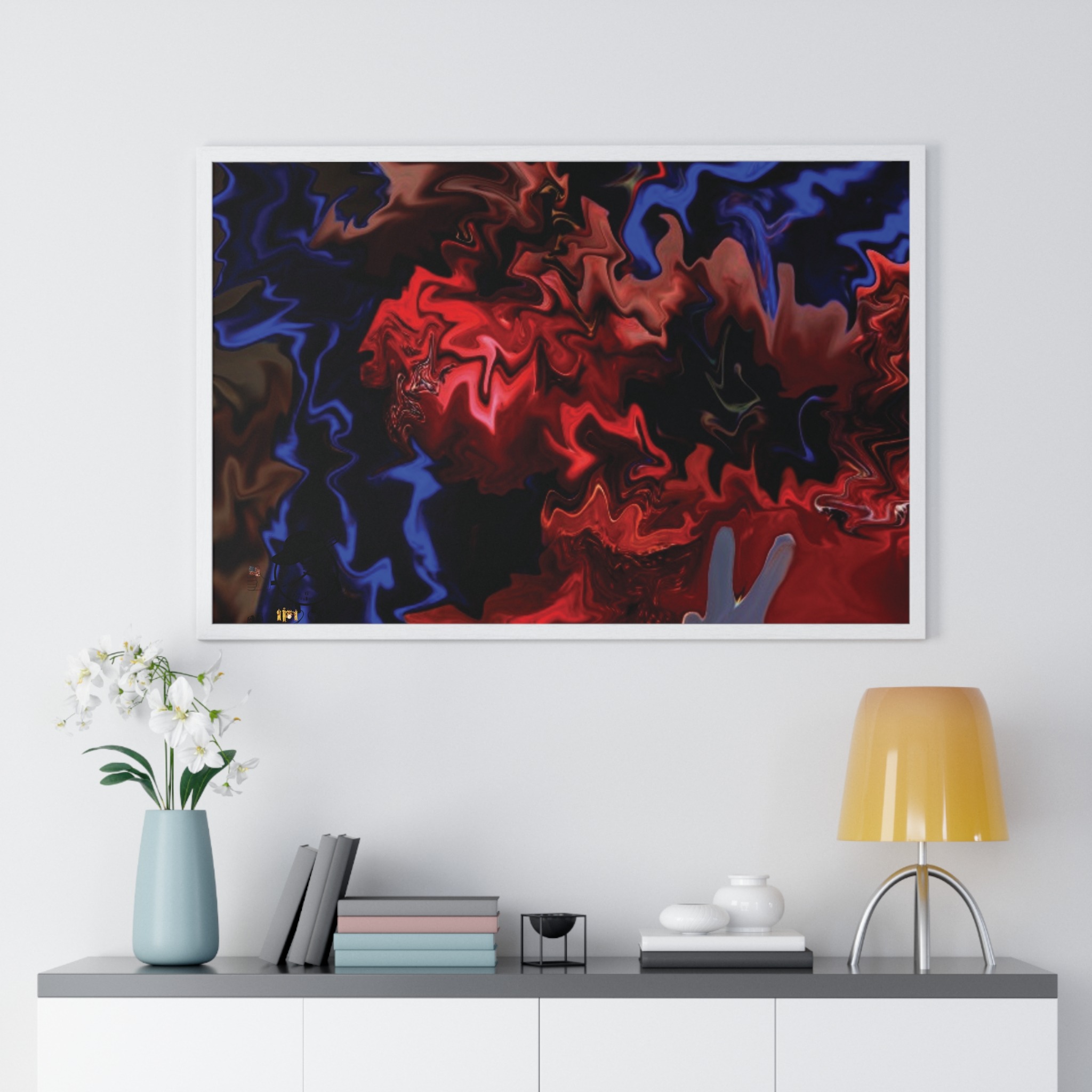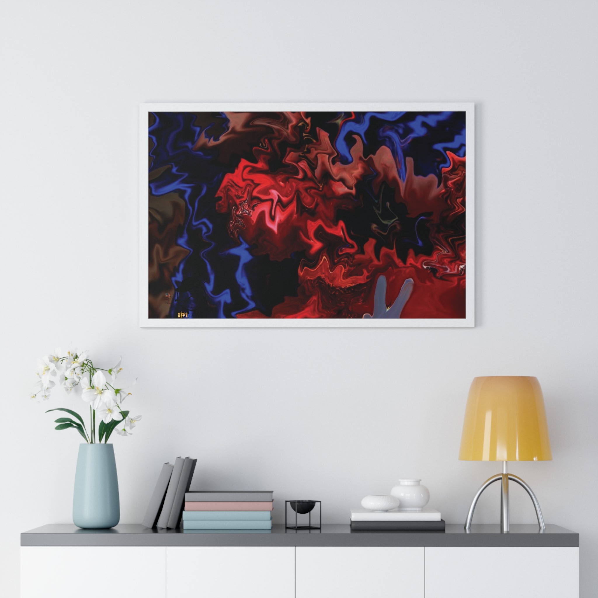 This horizontal framed poster brings a pulse of abstract motion into a living space. Deep reds and electric blues swirl across museum-grade matte paper, printed with vivid pigment inks that hold their intensity over time. The slim wooden frame (black or white) and plexiglass front create a gallery-ready silhouette, while pre-installed hanging hardware means it’s ready to display the moment it arrives. Sized for tabletop groupings or a statement above a console, the piece reads as modern, intense, and quietly cinematic — an artwork that shifts the mood of a room from ordinary to charged without overpowering it.
