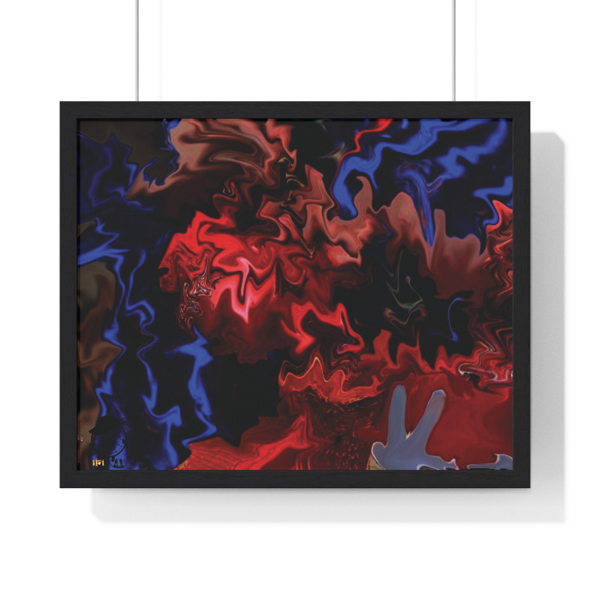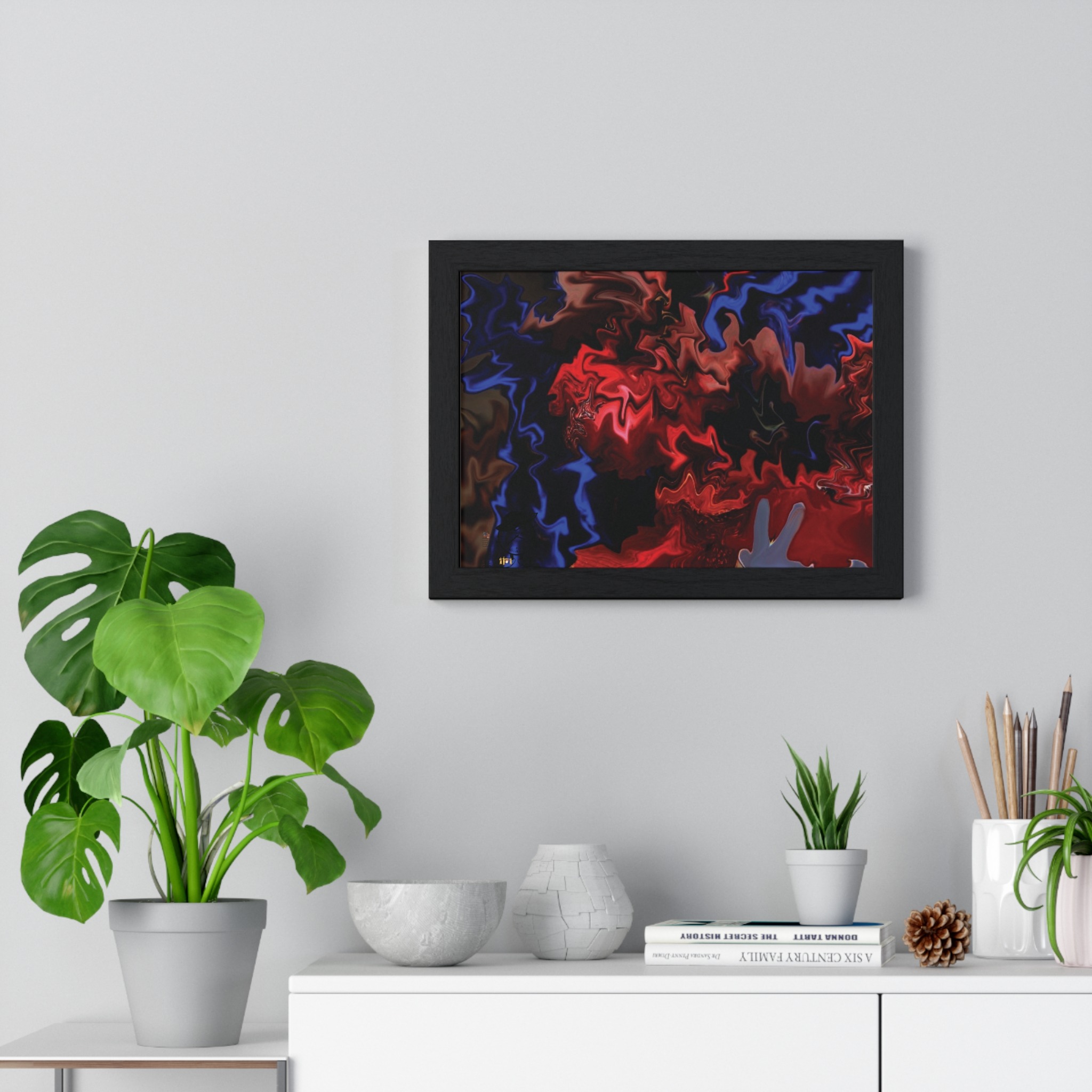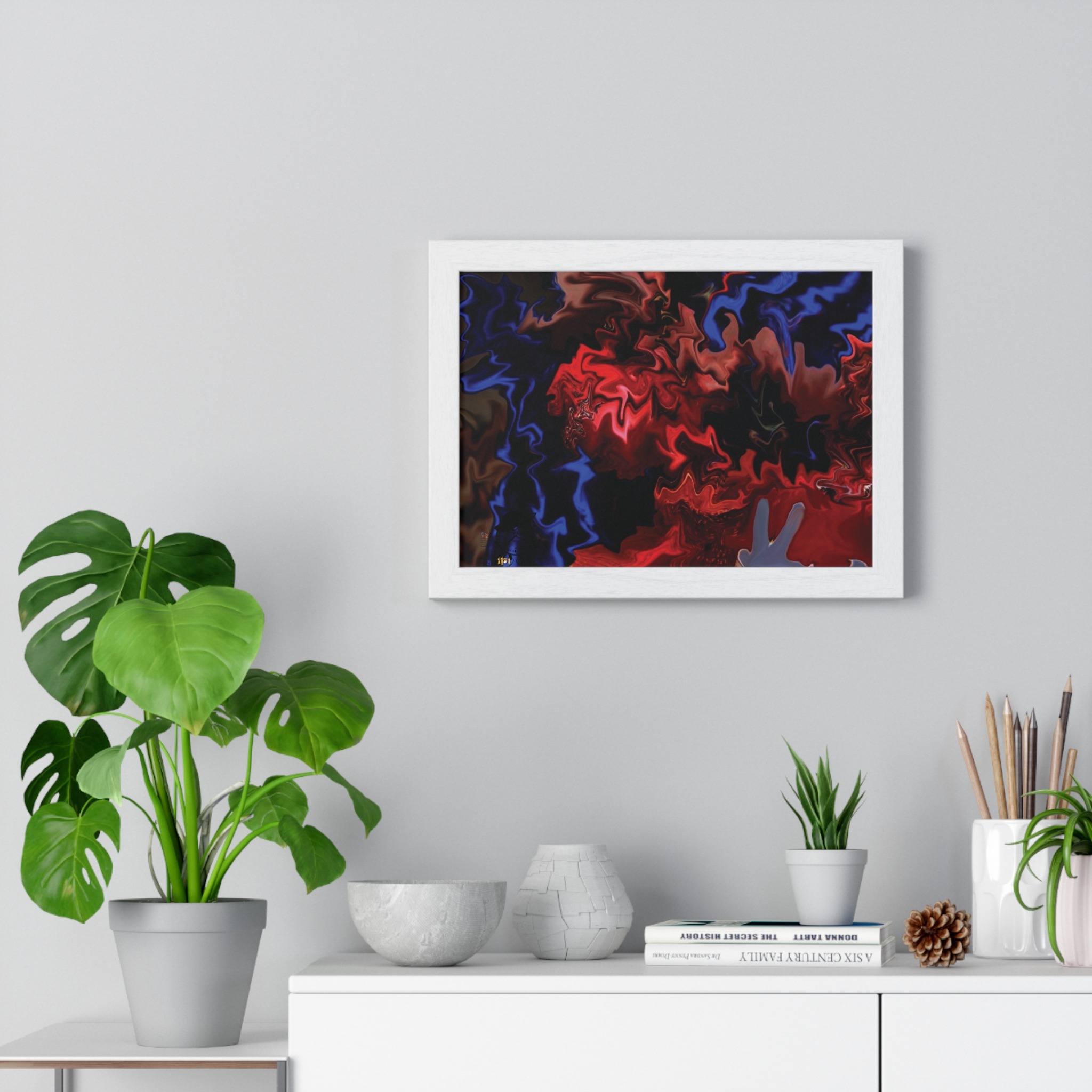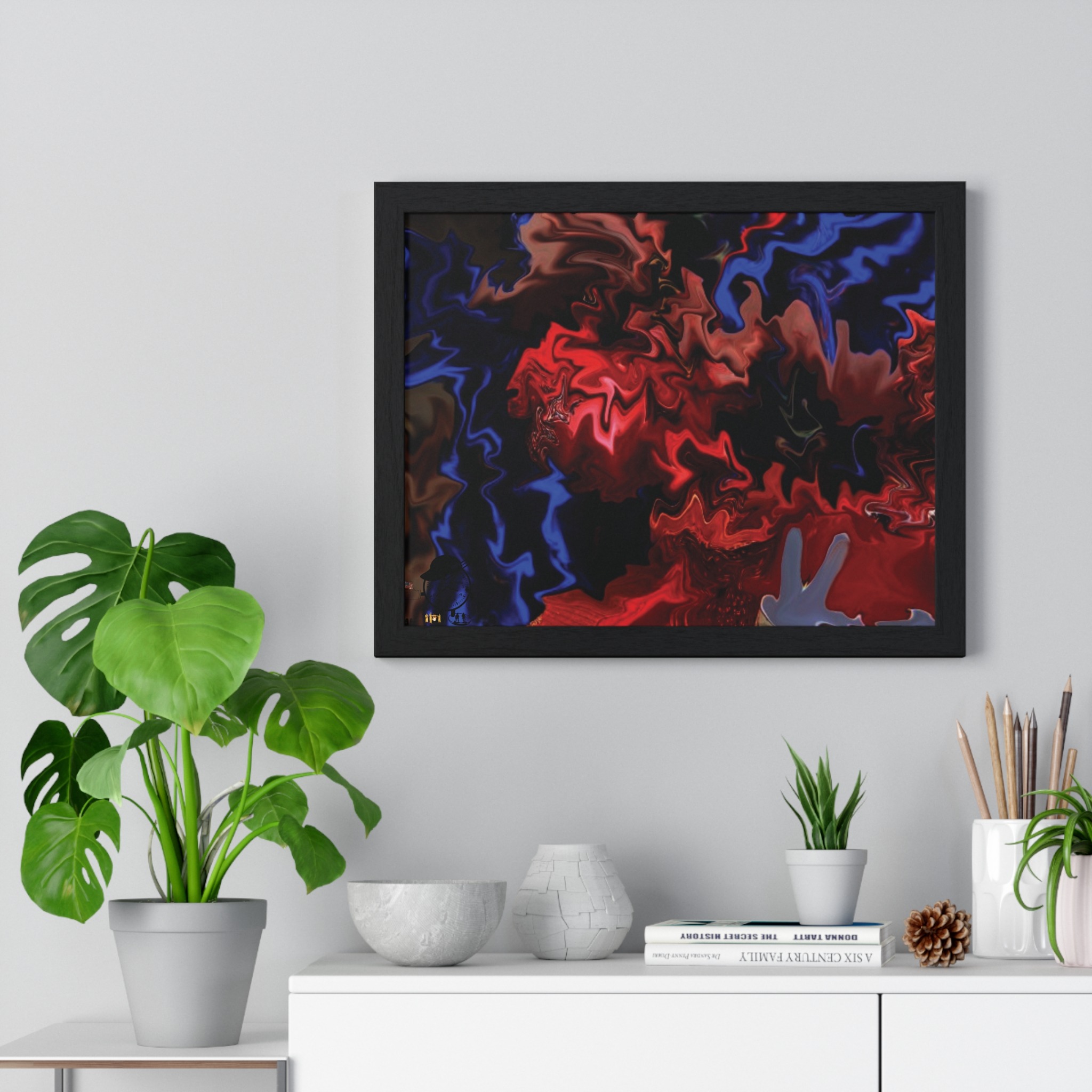 This horizontal framed poster brings a pulse of abstract motion into a living space. Deep reds and electric blues swirl across museum-grade matte paper, printed with vivid pigment inks that hold their intensity over time. The slim wooden frame (black or white) and plexiglass front create a gallery-ready silhouette, while pre-installed hanging hardware means it’s ready to display the moment it arrives. Sized for tabletop groupings or a statement above a console, the piece reads as modern, intense, and quietly cinematic — an artwork that shifts the mood of a room from ordinary to charged without overpowering it.
