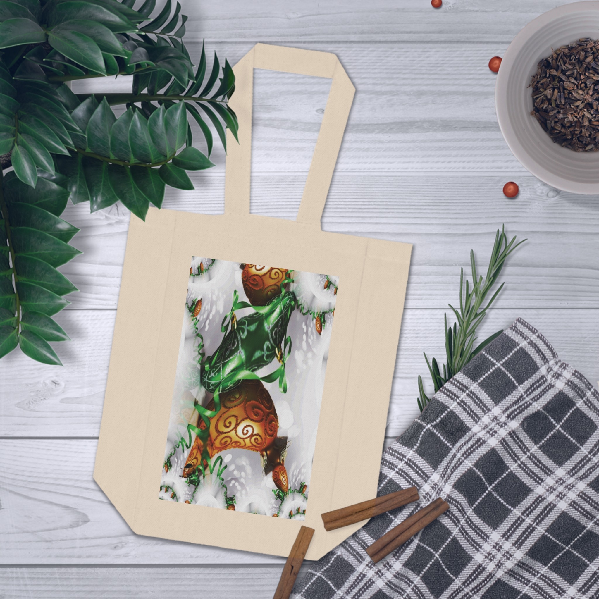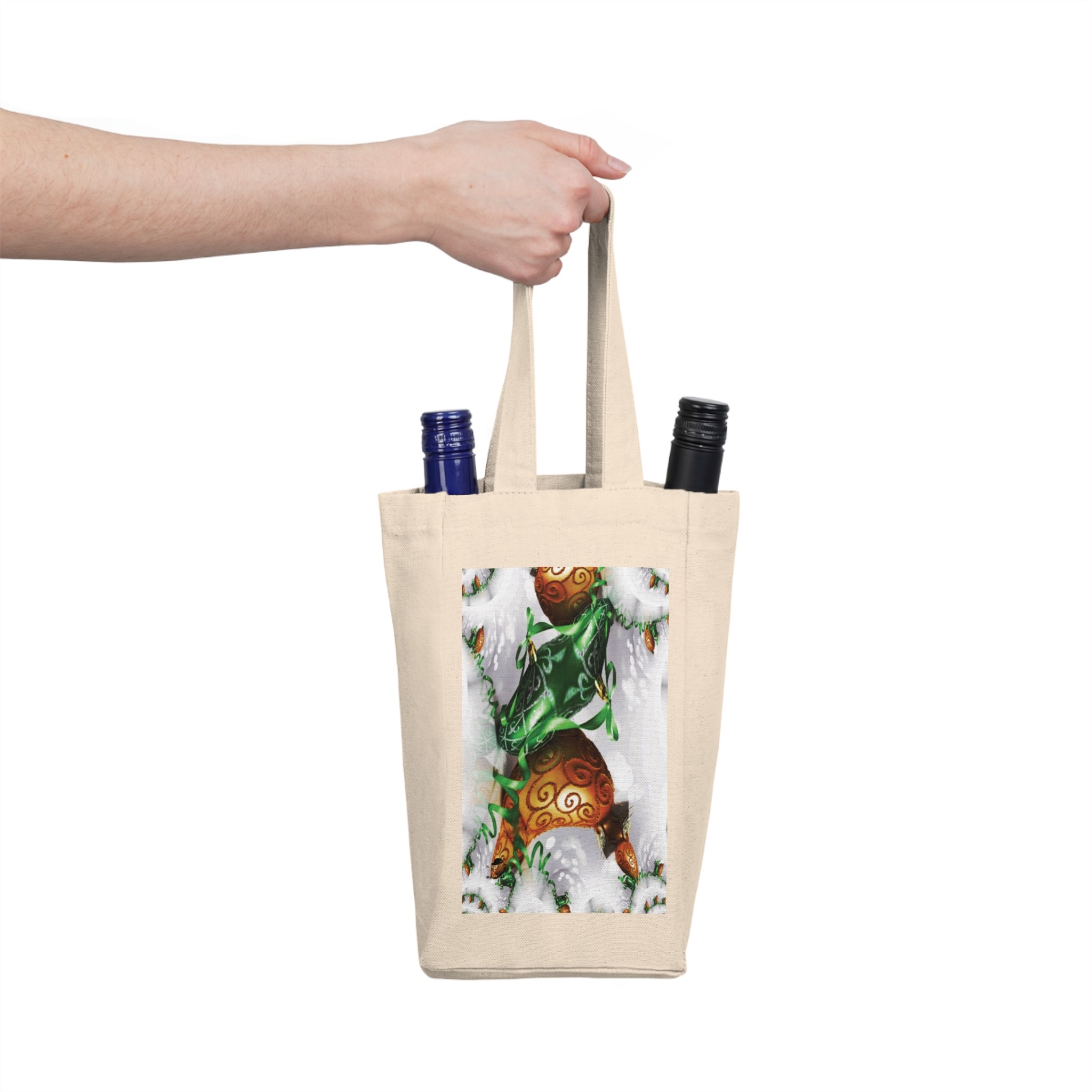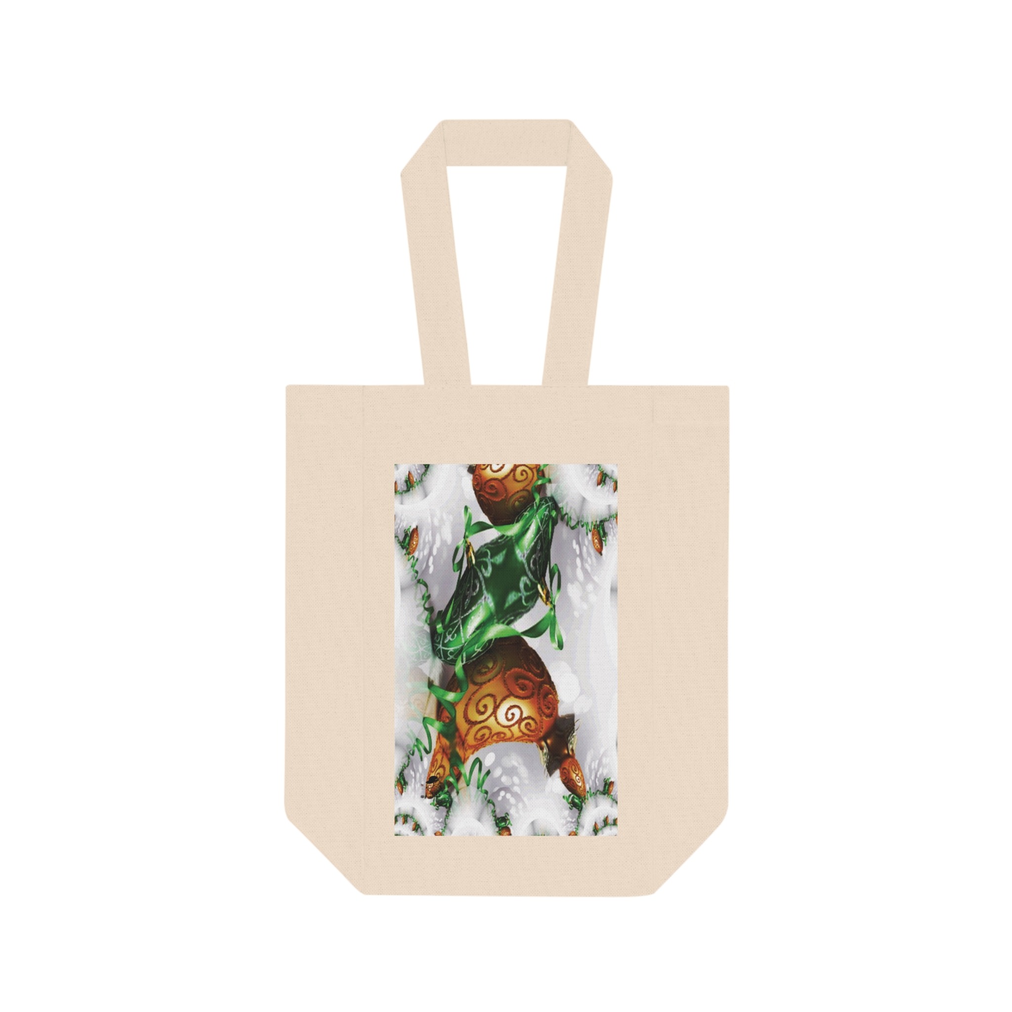 Carry two bottles with calm confidence. This sturdy cotton canvas wine tote keeps bottles upright and separated with a sewn-in divider, while boxed corners give extra room for careful packing. The printed panel features a cozy, wintry illustration — swirls of evergreen and ornament tones framed by soft snowy accents — that blends seasonal charm with everyday usability. Long, reinforced handles sit comfortably in hand or over the shoulder. Bring this tote to small gatherings, market runs, or a chalet weekend; it looks at home tucked under an arm as you walk through falling snow or handed to a friend at a holiday potluck.