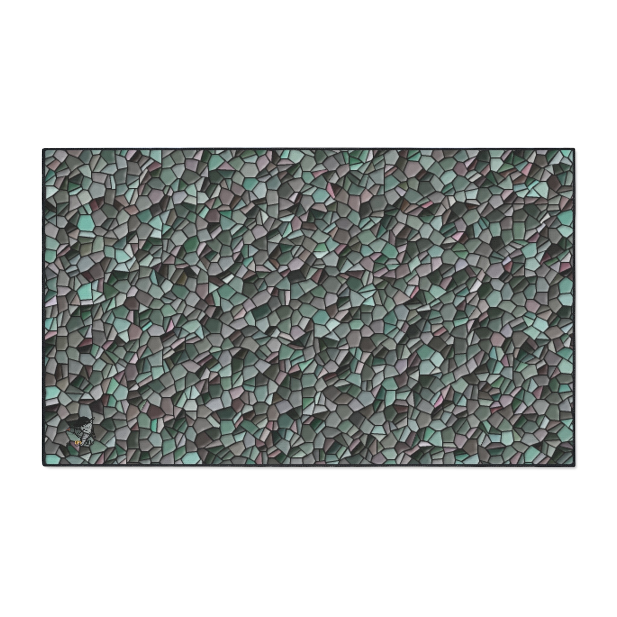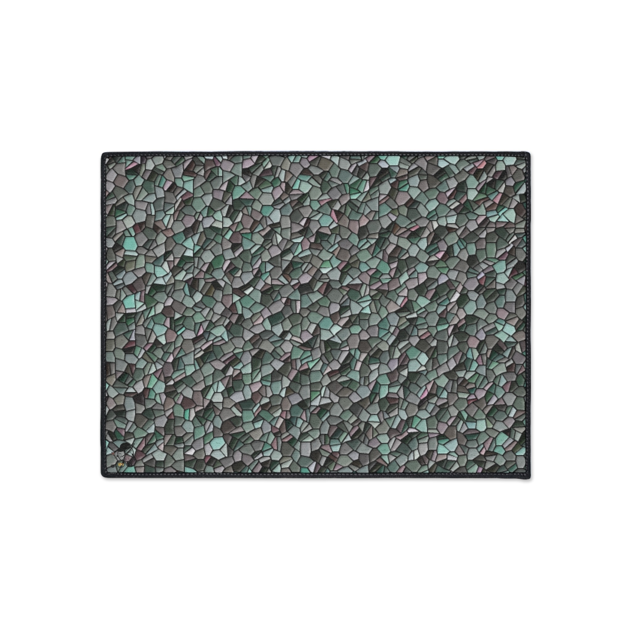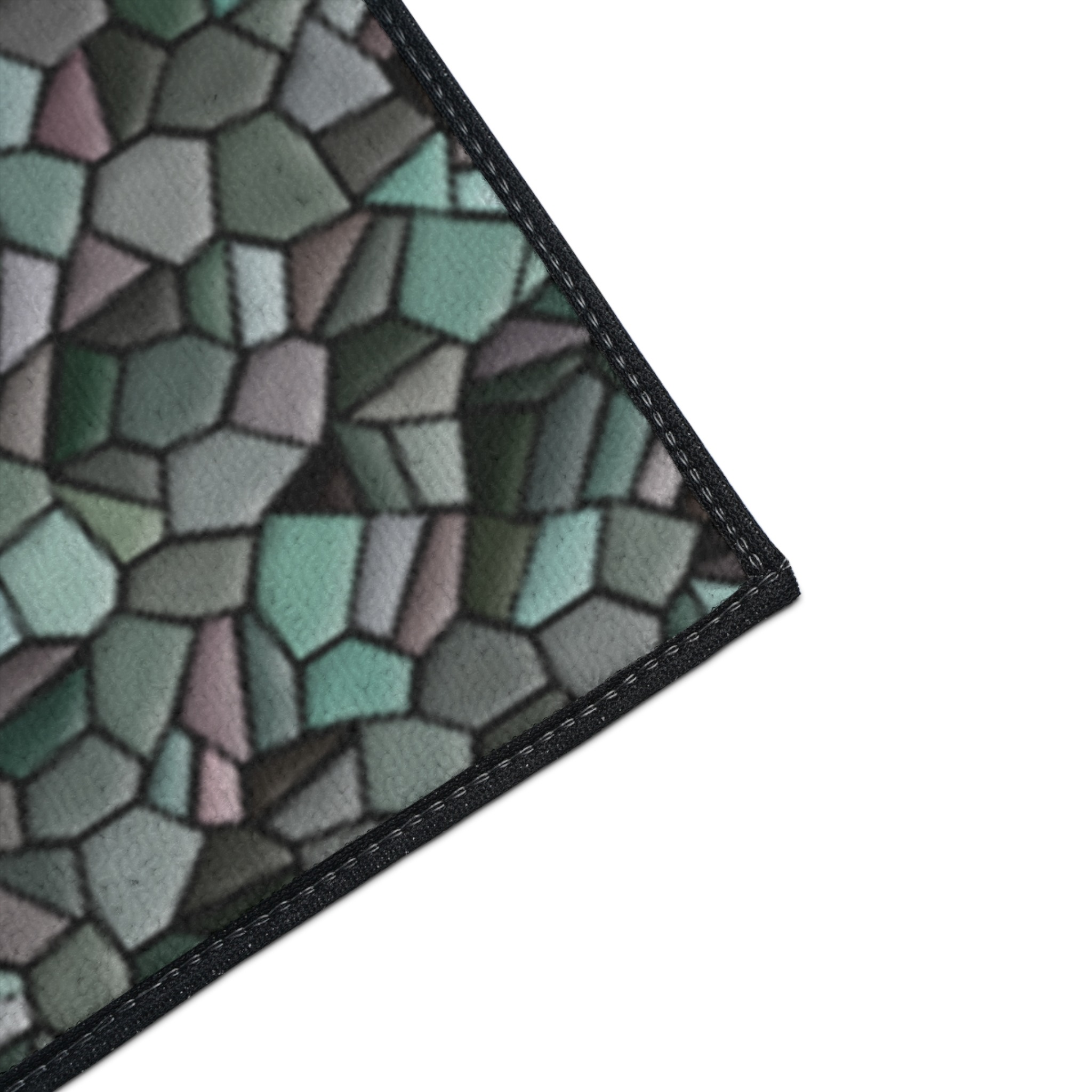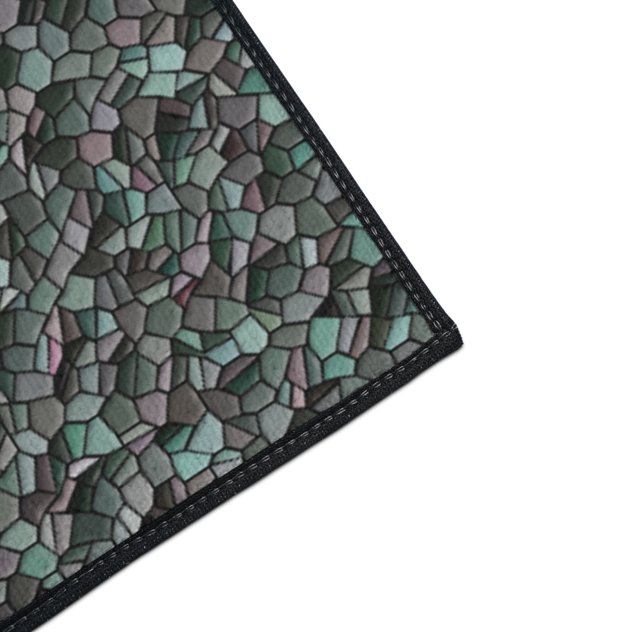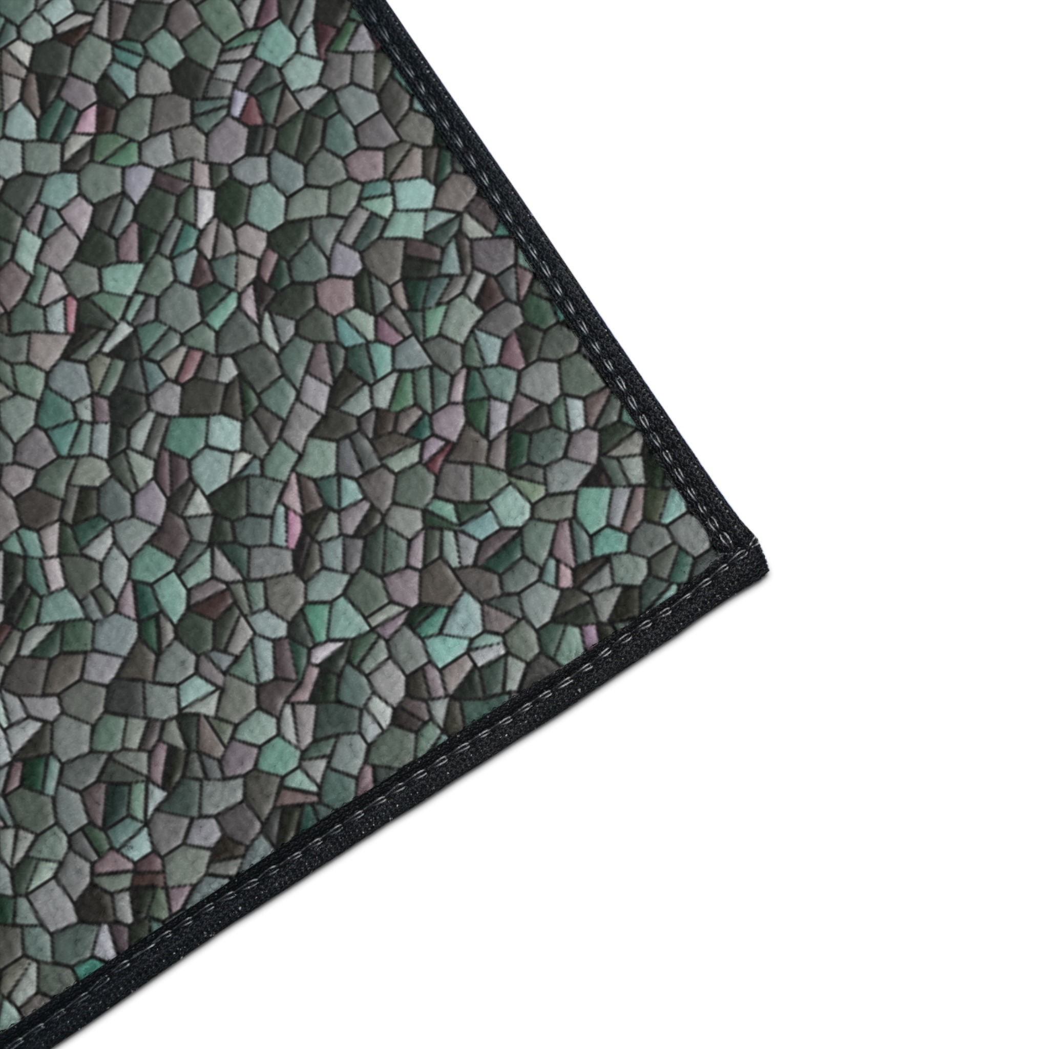 A rugged, artful floor mat that brings texture and calm to active spaces. The dense polyester surface shows a mosaic-like pattern of muted teals, grays, and soft mauves that reads like weathered stone up close and quiets a room from afar. Underfoot it feels steady and secure — a non-slip rubber backing and black-trimmed edge hold the mat in place while the printed face resists wear and keeps colors lively. Thoughtful assembly in the USA using global parts means you get durability and clean, consistent printing that fits entryways, workstations, or studio corners where both function and atmosphere matter.