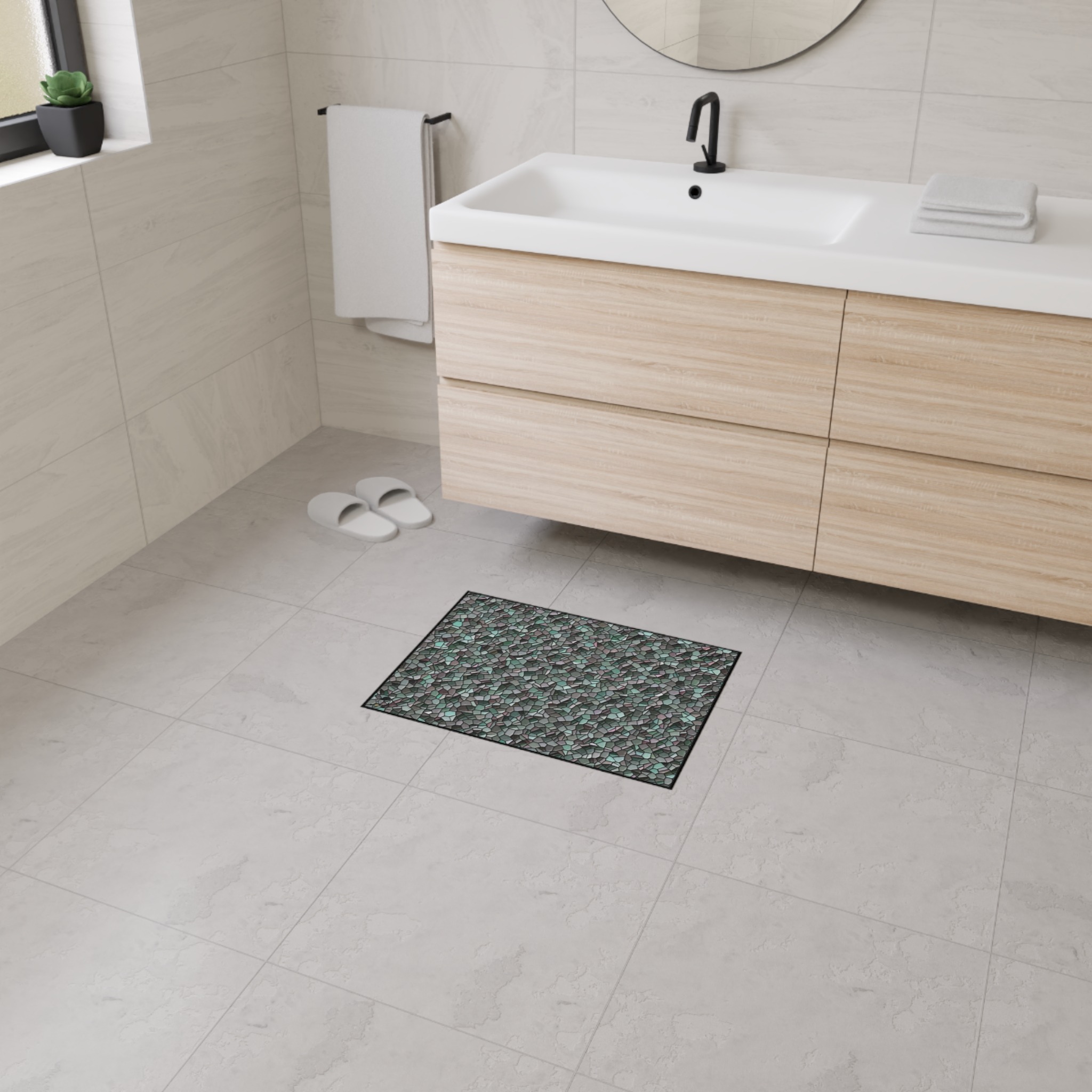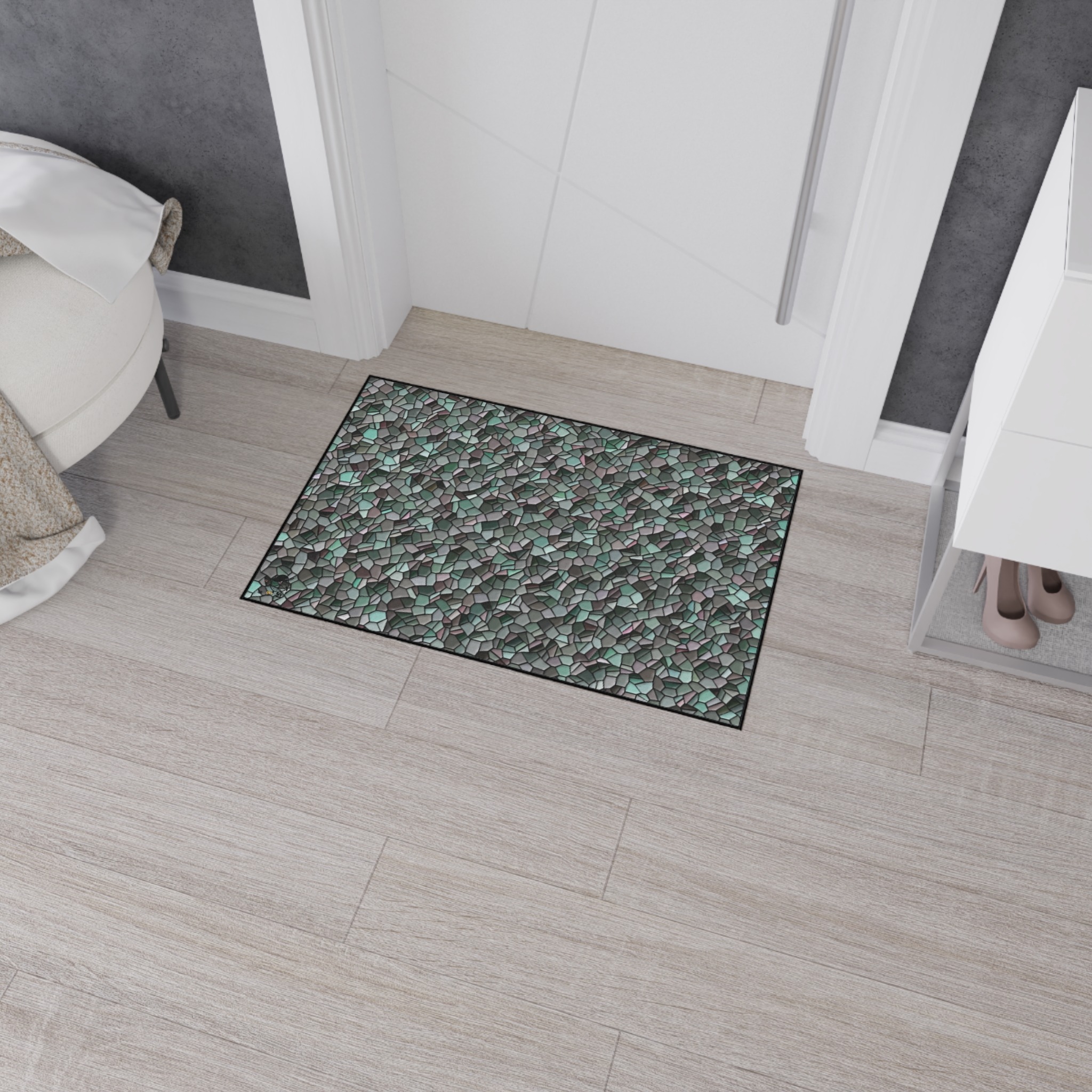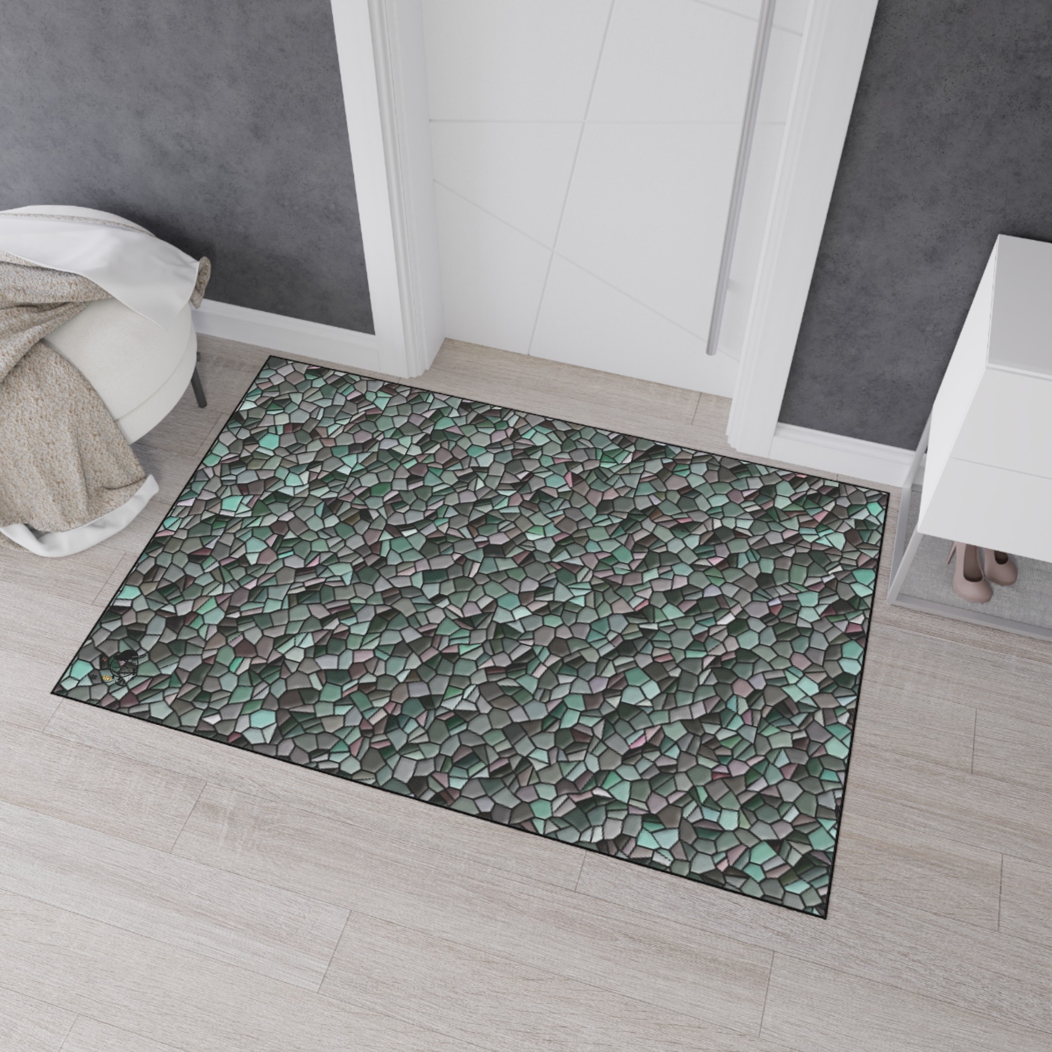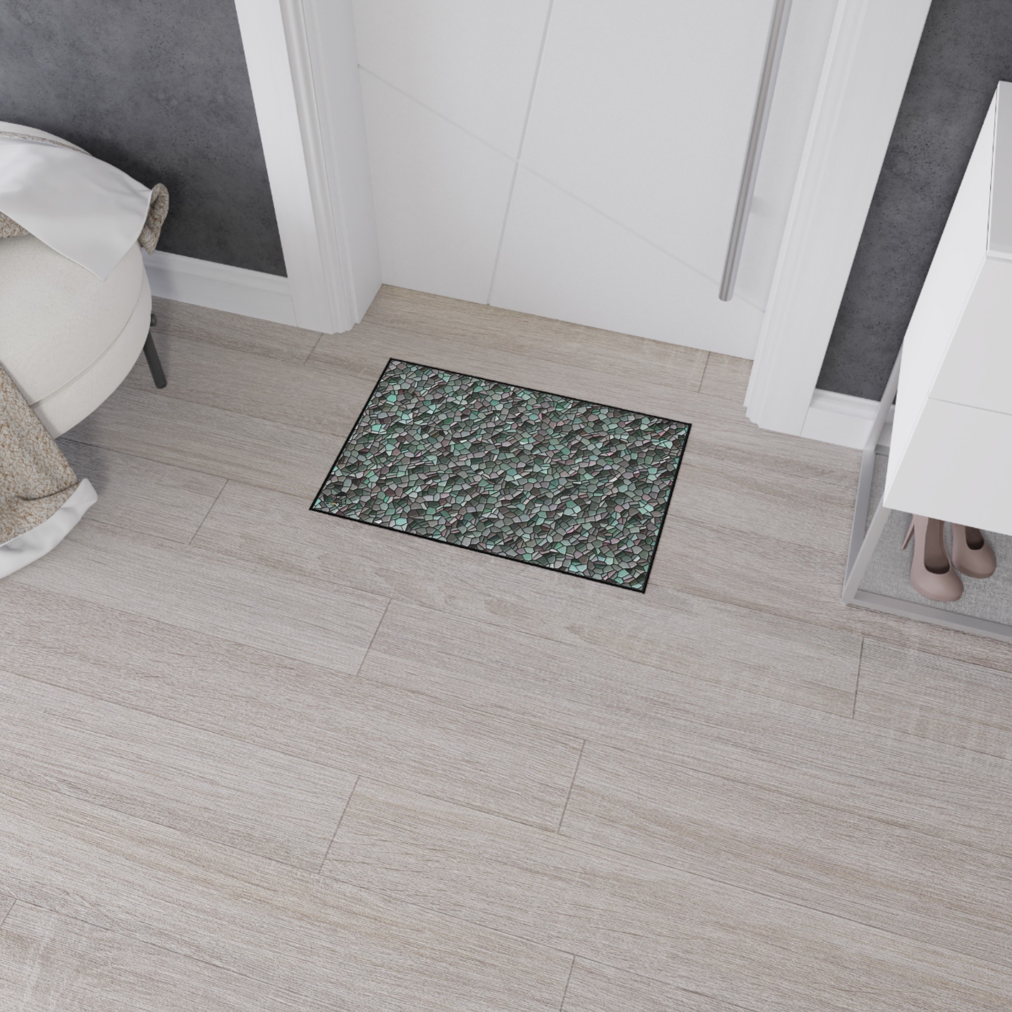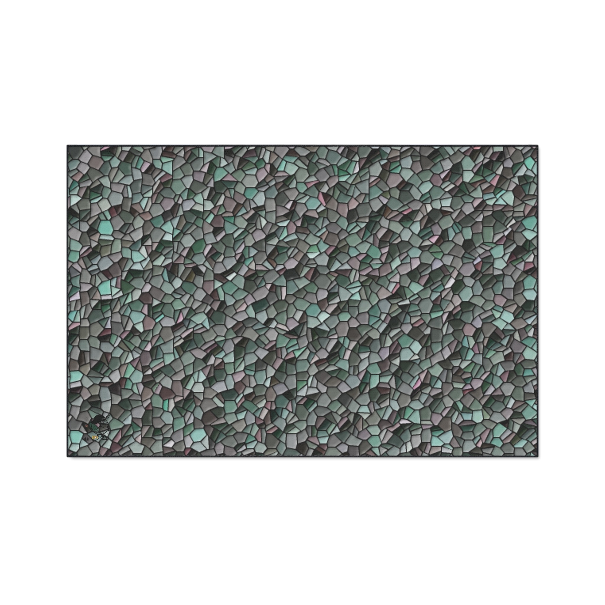 A rugged, artful floor mat that brings texture and calm to active spaces. The dense polyester surface shows a mosaic-like pattern of muted teals, grays, and soft mauves that reads like weathered stone up close and quiets a room from afar. Underfoot it feels steady and secure — a non-slip rubber backing and black-trimmed edge hold the mat in place while the printed face resists wear and keeps colors lively. Thoughtful assembly in the USA using global parts means you get durability and clean, consistent printing that fits entryways, workstations, or studio corners where both function and atmosphere matter.