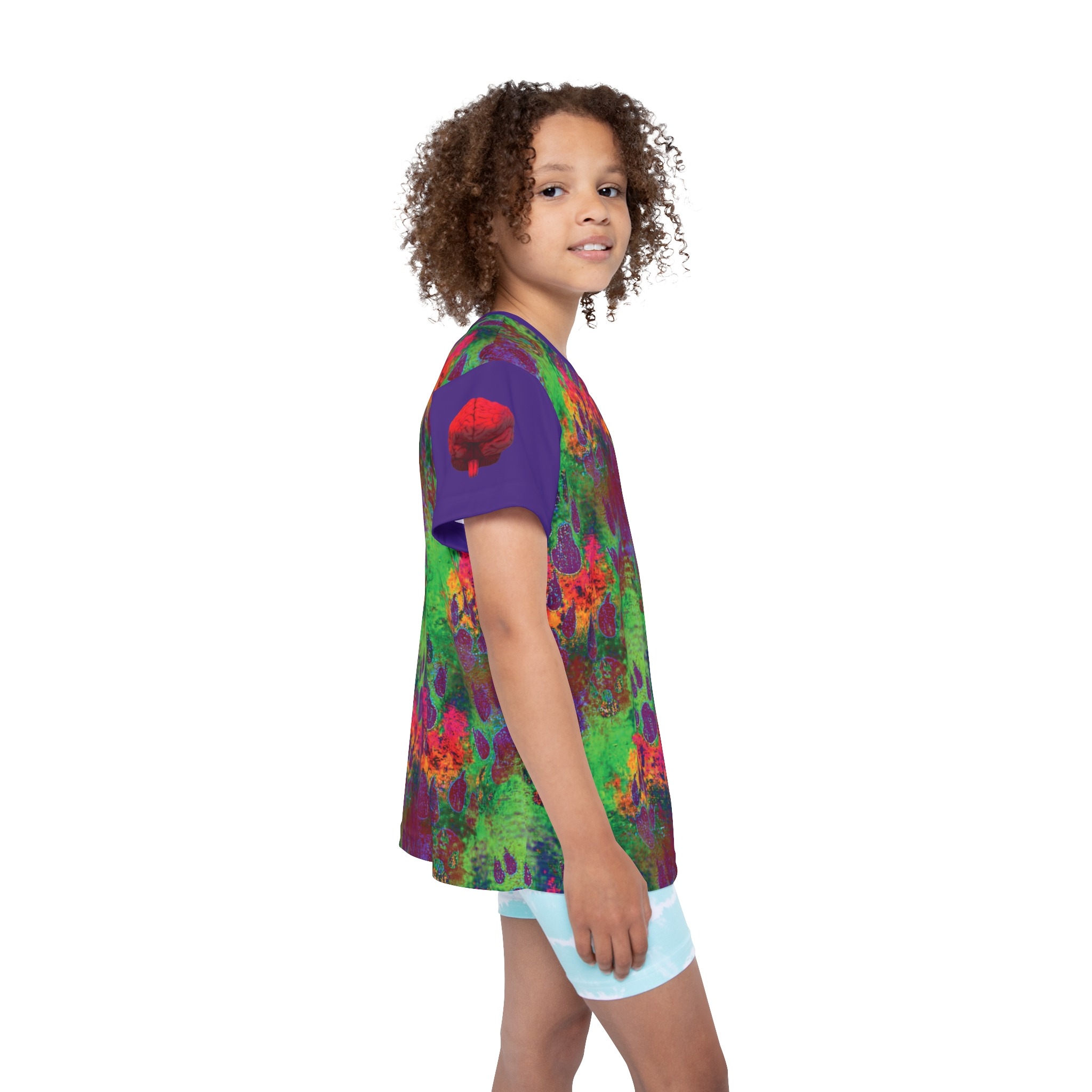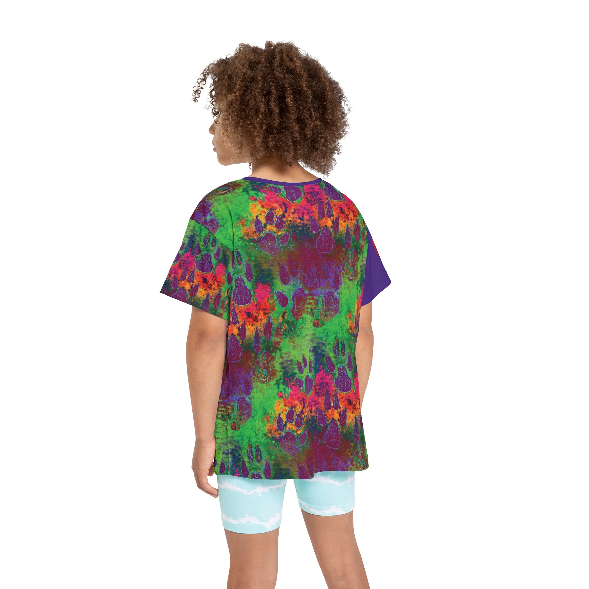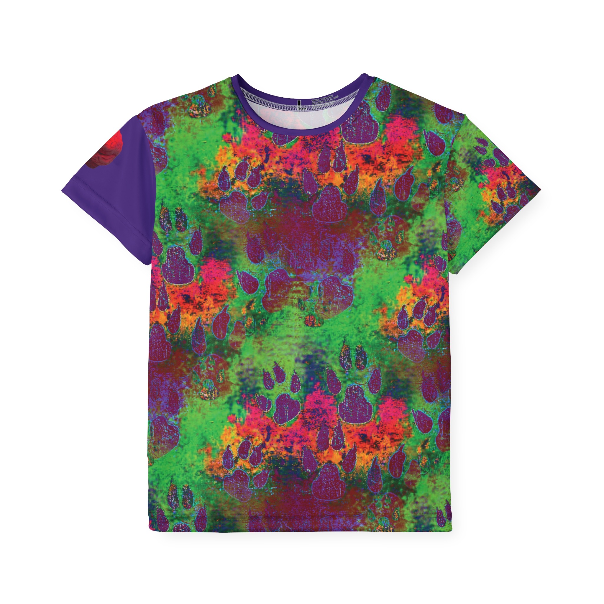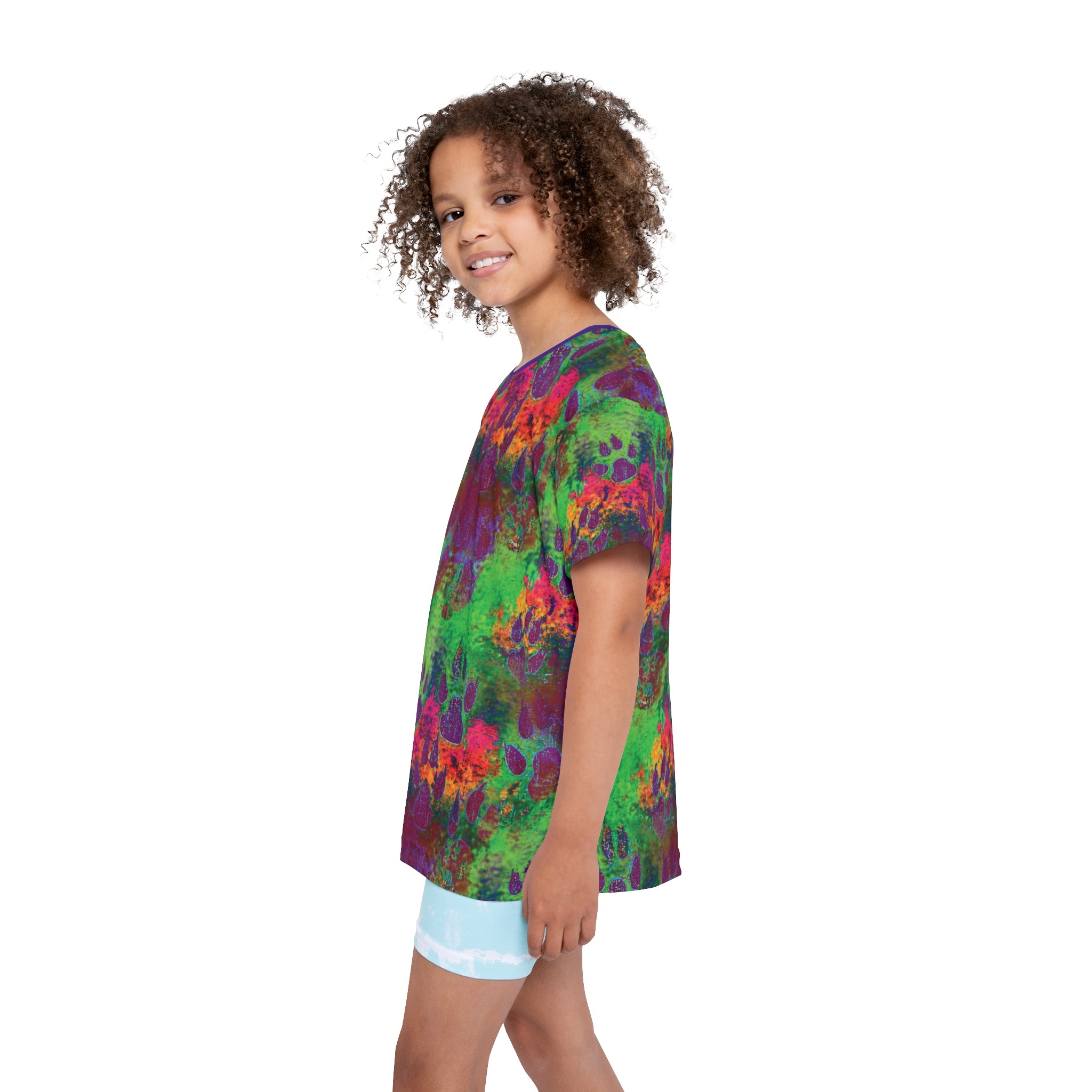 Splash into playtime with this bold, all-over printed kids sports jersey. Colorful paw prints and layered textures create a lively, slightly grungy pattern that feels energetic and adventurous. The ultra-light, moisture-wicking polyester keeps kids cool during games, practices, or backyard explorations. Stretch-friendly ribbing at the collar and armholes means it moves with them and snaps back into shape after a tumble or wash. Bright, durable printing keeps the artwork vivid run after run, while the printed care label and matched seam thread keep the look clean and comfortable. Designed to stand up to active days and creative messes, this jersey brings personality to every play session.