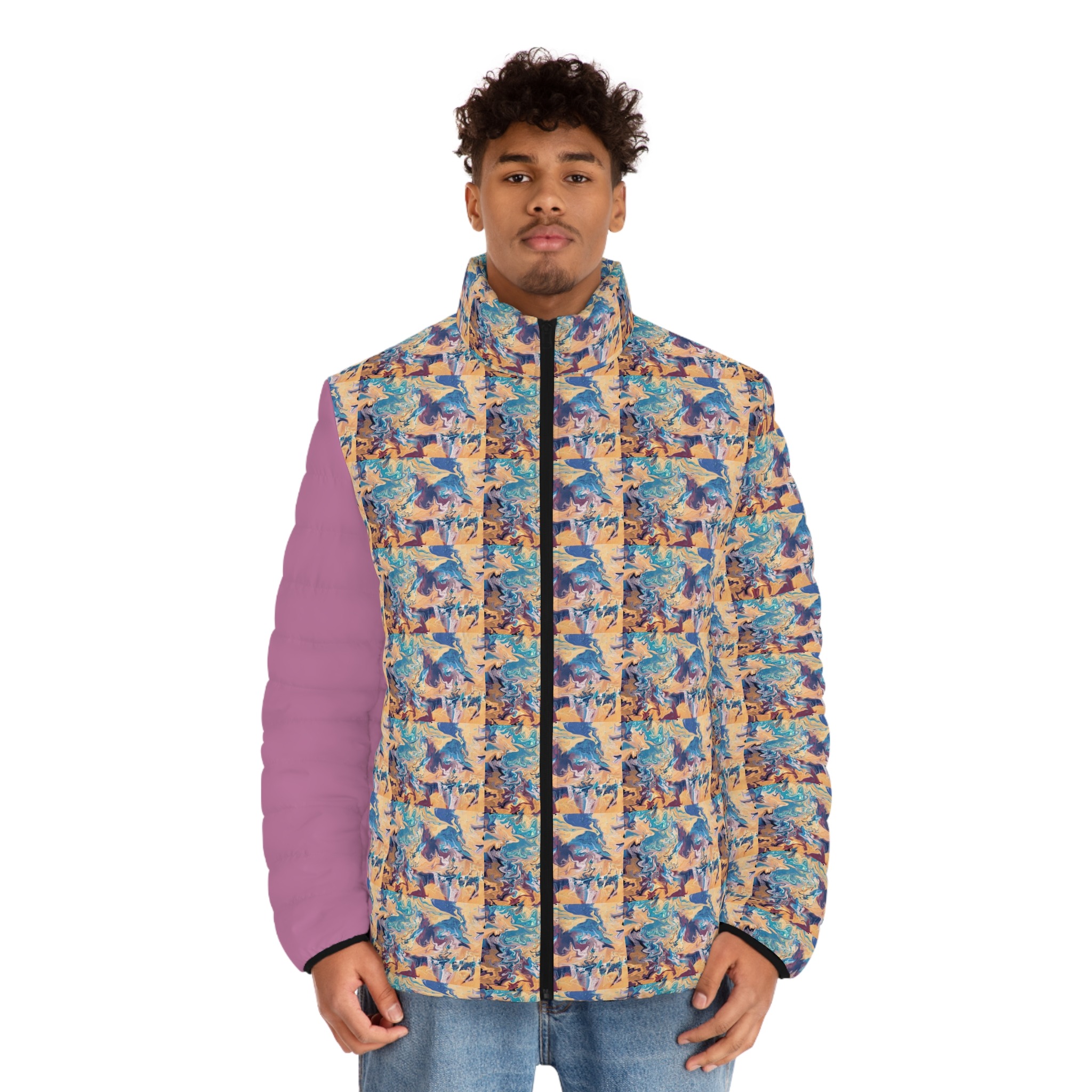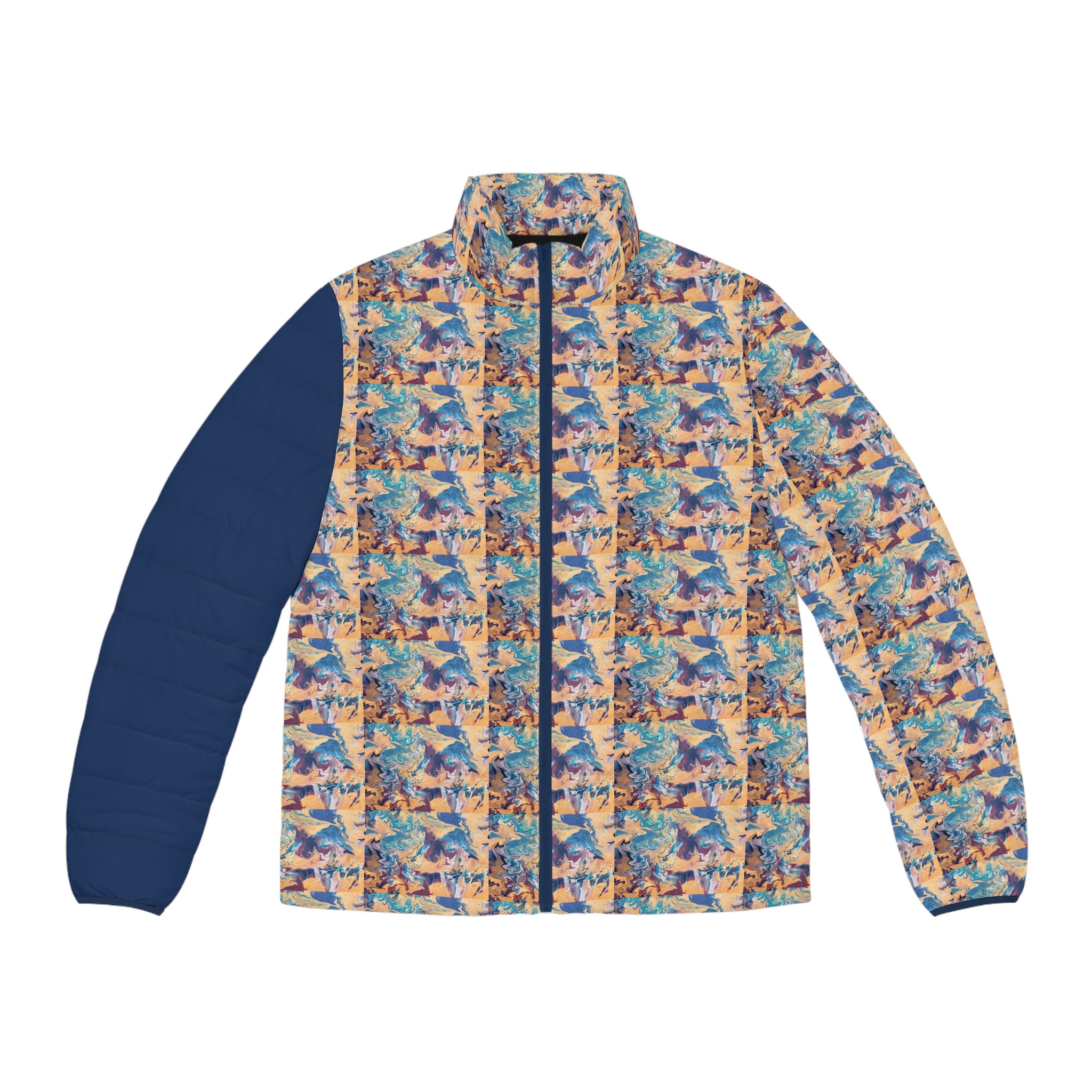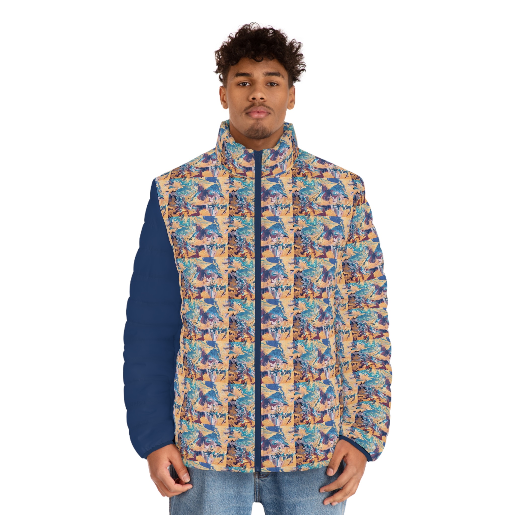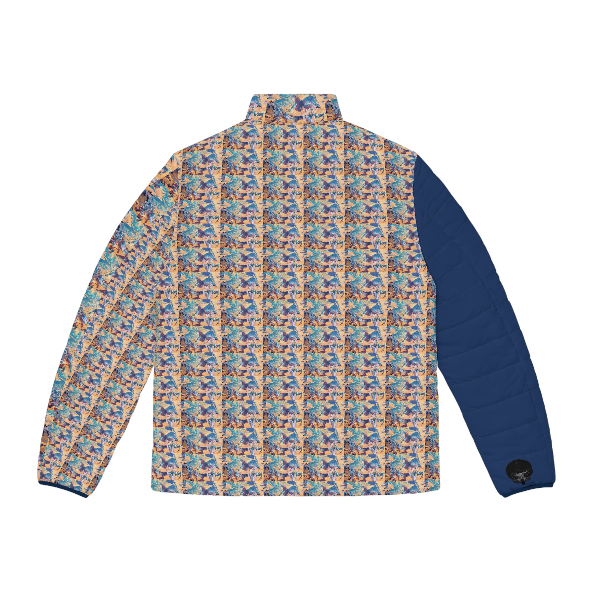 A lightweight puffer that feels like a brisk seaside morning — airy, quilted warmth with a playful, painterly all-over print and a contrasting navy sleeve that gives it a handcrafted, collage look. The stand-up collar blocks wind while the soft black cotton-like lining keeps things comfortable against the skin. Reach into the roomy side pockets to tuck your hands or hold small essentials. It layers easily over hoodies or merino tees for crisp walks through coastal towns, weekend markets, or late-afternoon gallery visits. This jacket speaks to someone who likes color, texture, and a practical silhouette that moves from city streets to trailheads without fuss.