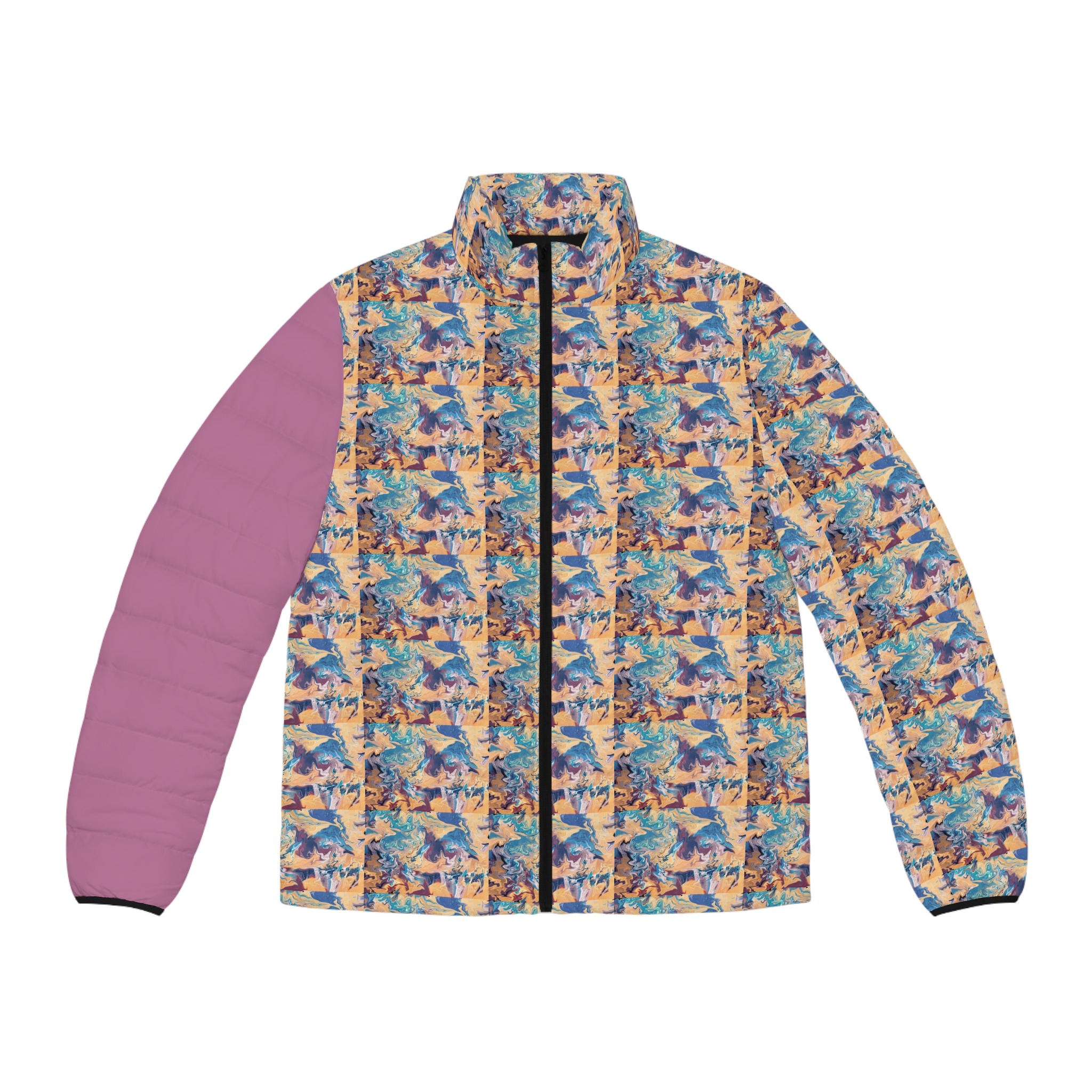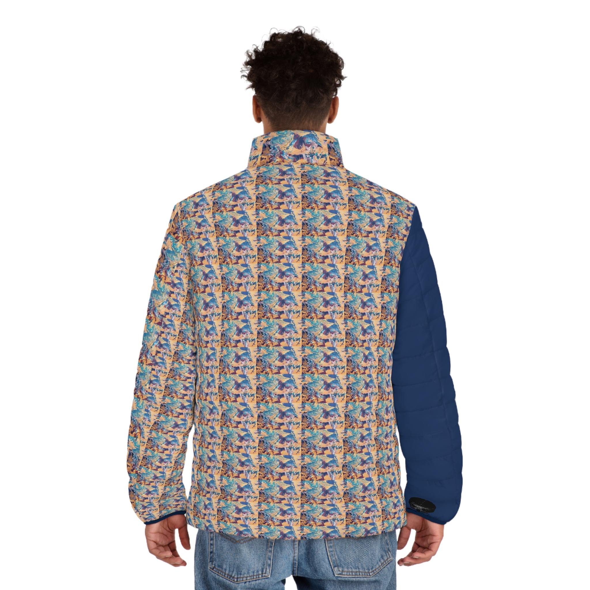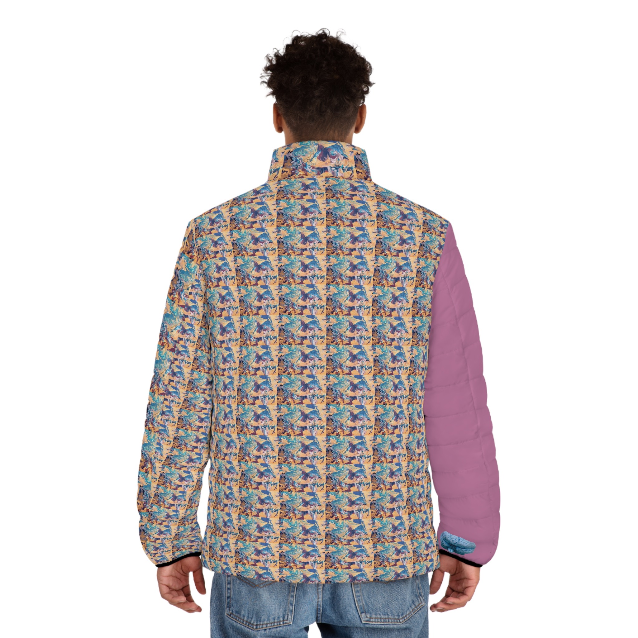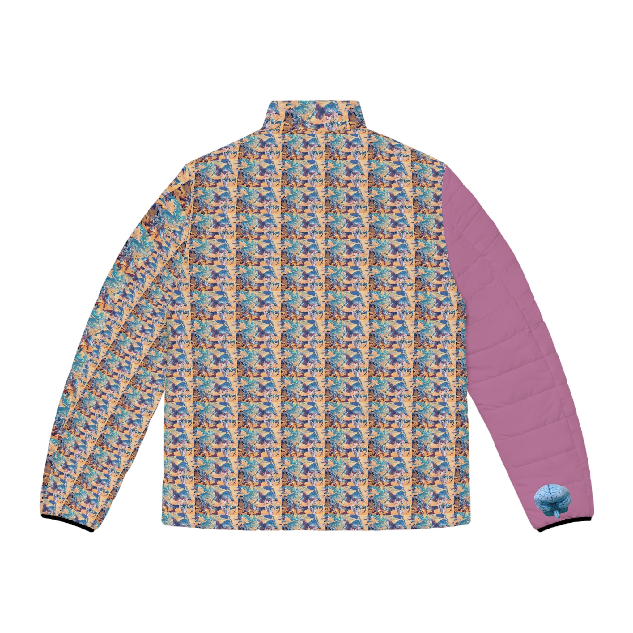 A lightweight puffer that feels like a brisk seaside morning — airy, quilted warmth with a playful, painterly all-over print and a contrasting navy sleeve that gives it a handcrafted, collage look. The stand-up collar blocks wind while the soft black cotton-like lining keeps things comfortable against the skin. Reach into the roomy side pockets to tuck your hands or hold small essentials. It layers easily over hoodies or merino tees for crisp walks through coastal towns, weekend markets, or late-afternoon gallery visits. This jacket speaks to someone who likes color, texture, and a practical silhouette that moves from city streets to trailheads without fuss.
