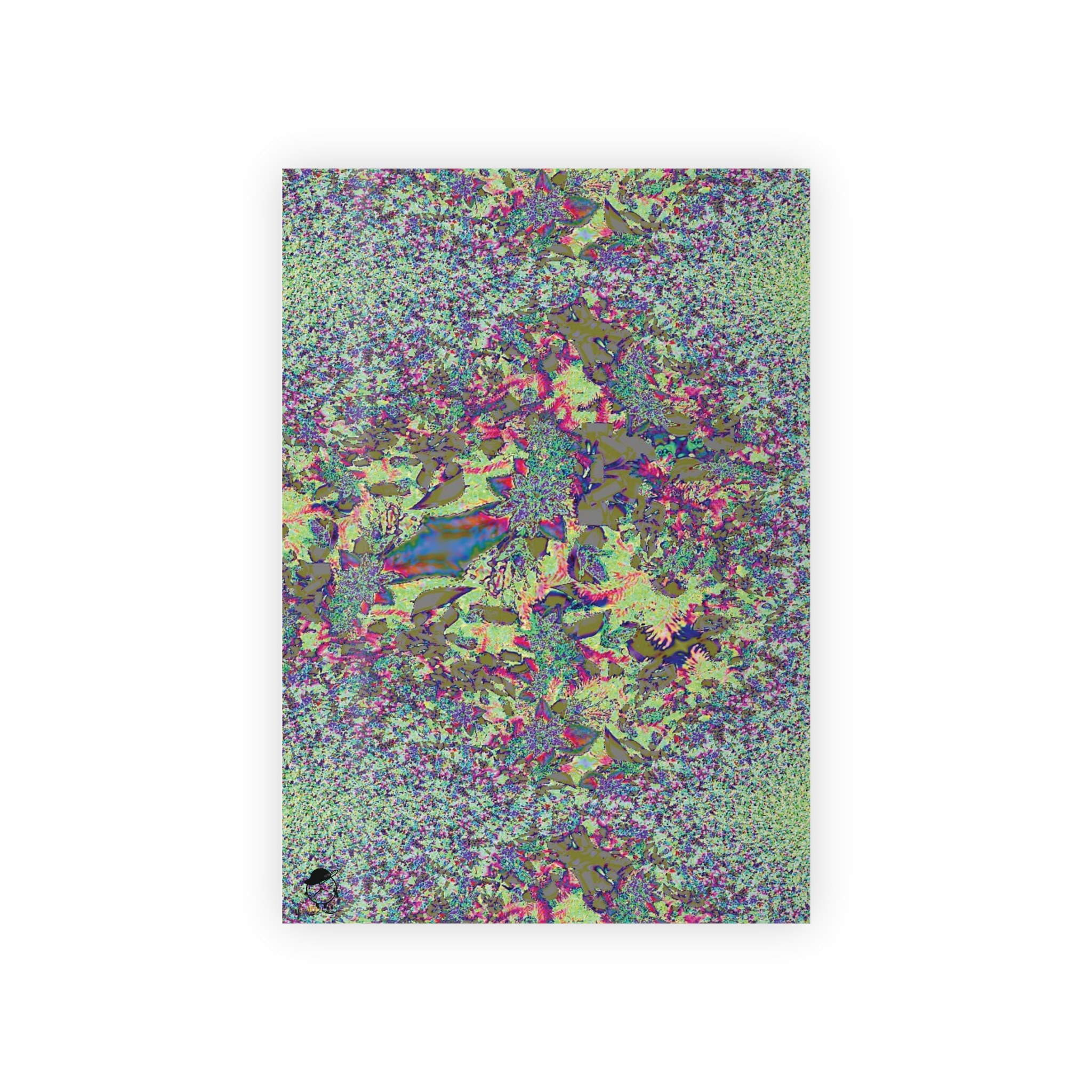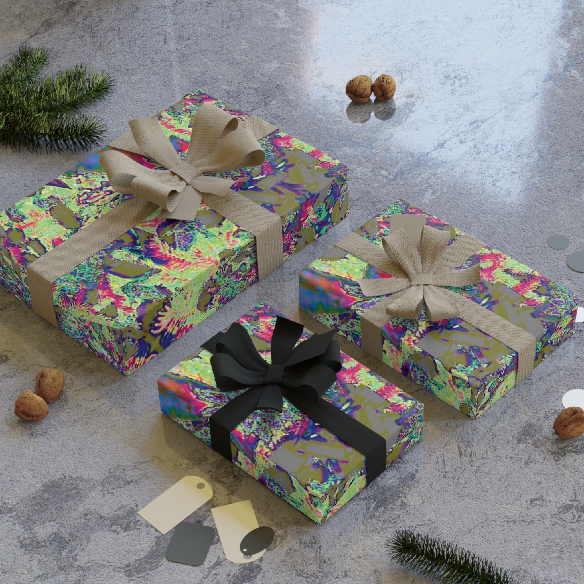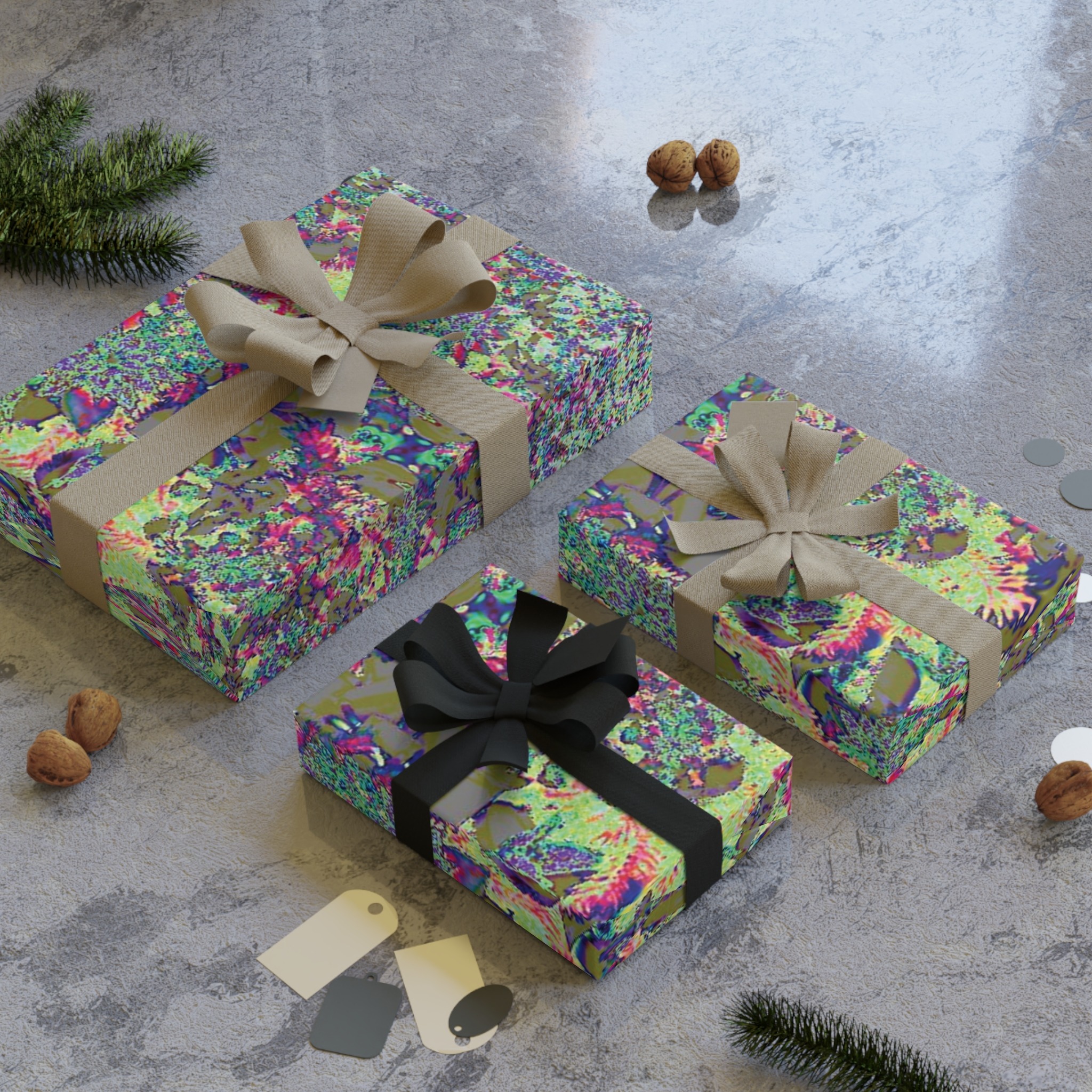 This roll of artful wrapping paper turns the small act of gift-giving into a moment of surprise. The print mixes shimmering greens, pinks, and indigo in an organic, almost psychedelic pattern that reads like a close-up of mossy stones or an abstract garden seen through rain. The satin surface catches light, giving each fold gentle highlights and a soft, tactile sheen that feels thoughtful to the touch. Lightweight but substantial at 95 gsm, the paper is easy to crease for neat edges yet durable enough to wrap multiple items. Sustainably sourced and fully recyclable, it lets you wrap with conscience as well as style — use it for birthdays, housewarmings, or to dress up a small present for someone who loves color and texture.