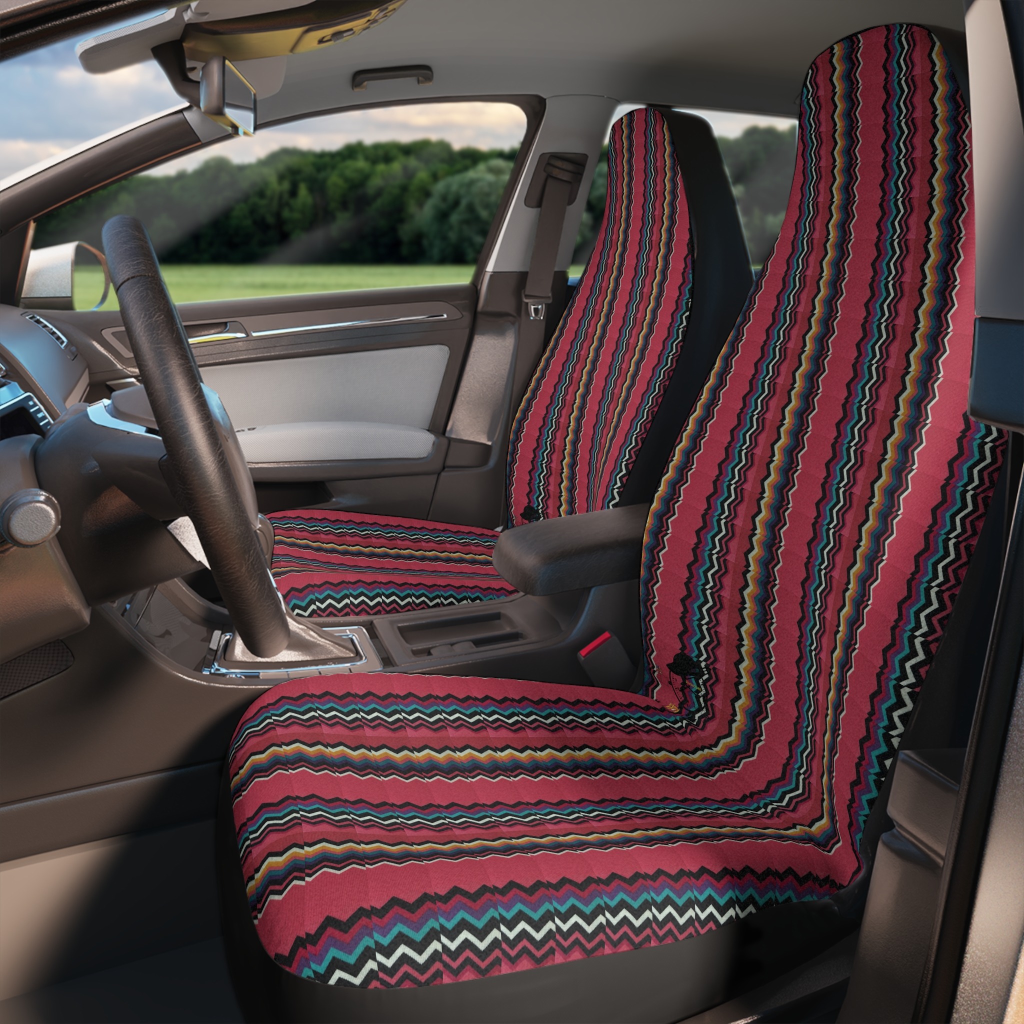 Slide these vibrant woven-stripe car seat covers over your daily driver and feel a little more at home on every ride. The warm red, gold and navy bands bring a handcrafted, southwest-inspired energy that livens up dull interiors and hides wear without shouting. Soft to the touch up front and made from thick, durable polyester, they stand up to spills and sun while slipping on quickly with elastic edges and hook straps for a snug fit. Two identical covers are included — the backs are solid black for a clean look — and the overall effect is cozy, lived-in, and quietly bold. Note: not for seats with side airbags.