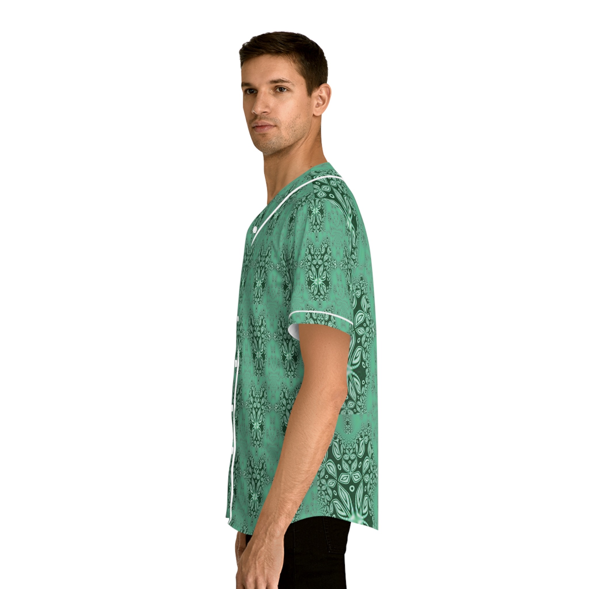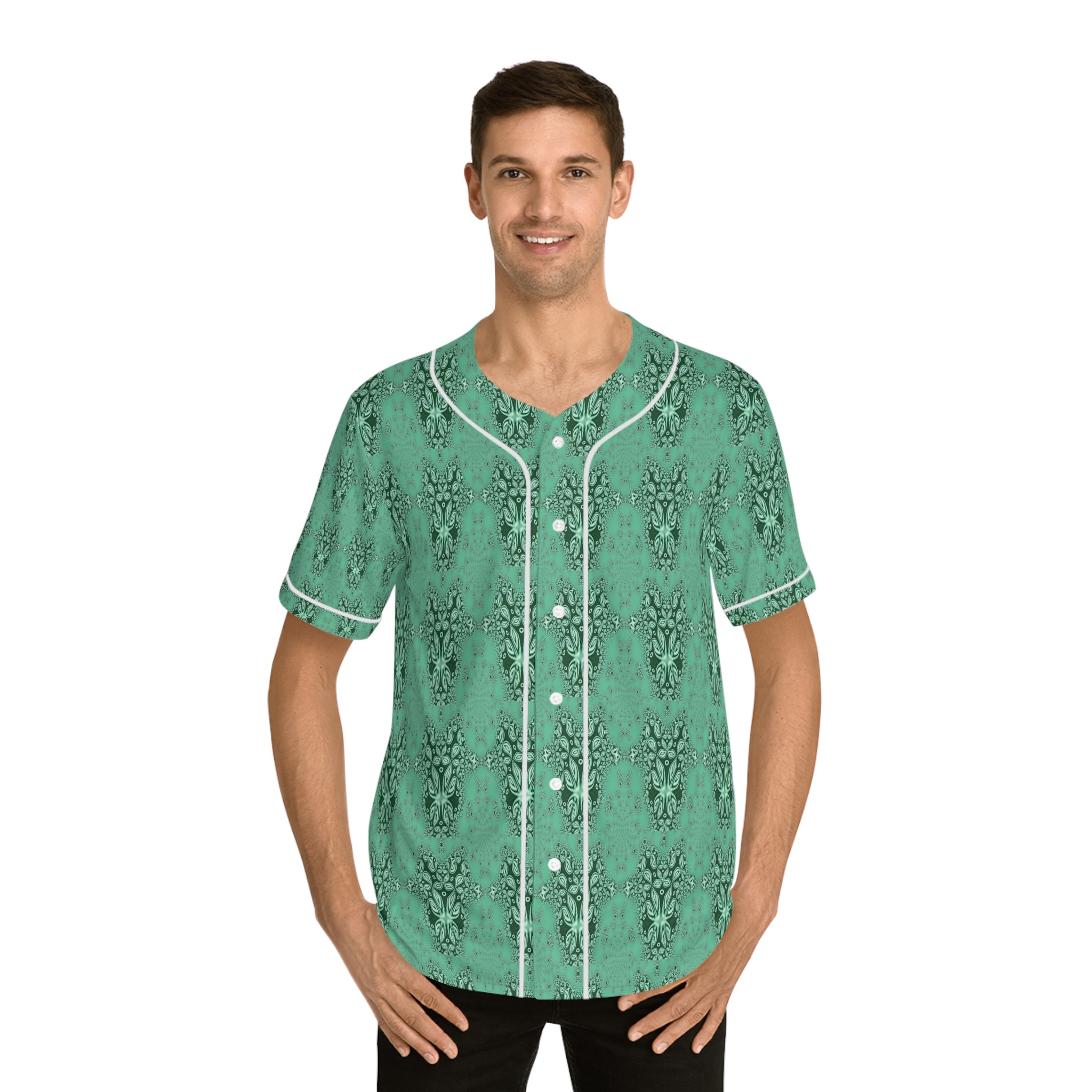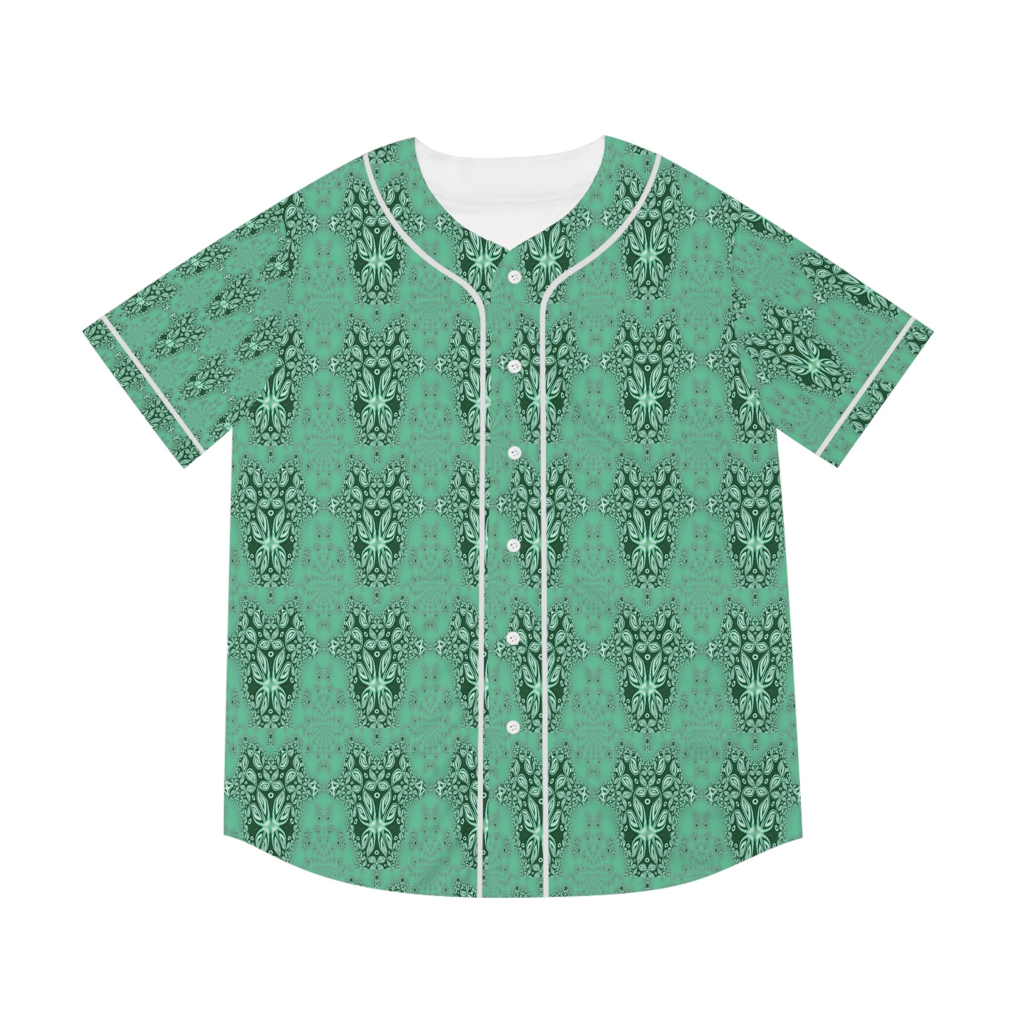 This lightweight baseball jersey brings vintage charm to active days. The all-over mint-green damask pattern reads like an heirloom textile reimagined for movement — ornate but soft, with subtle symmetry that catches the eye without shouting. The rounded hem and full-button front let it layer easily over tees or tanks. Breathable, moisture-wicking polyester keeps skin dry during long practices, errands, or warm-weather hangs. Choose black or white trim and buttons to dial the contrast up or down. Wear it to neighborhood games, weekend markets, or evenings at the skate park — it moves with you and keeps a quietly curated look.