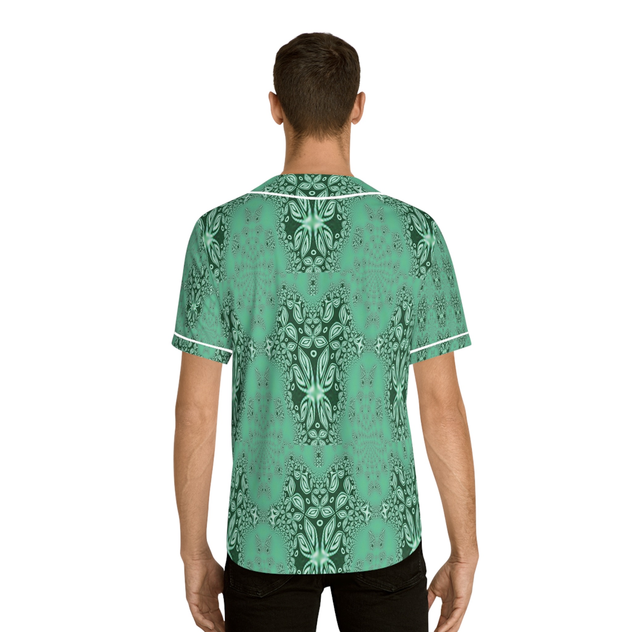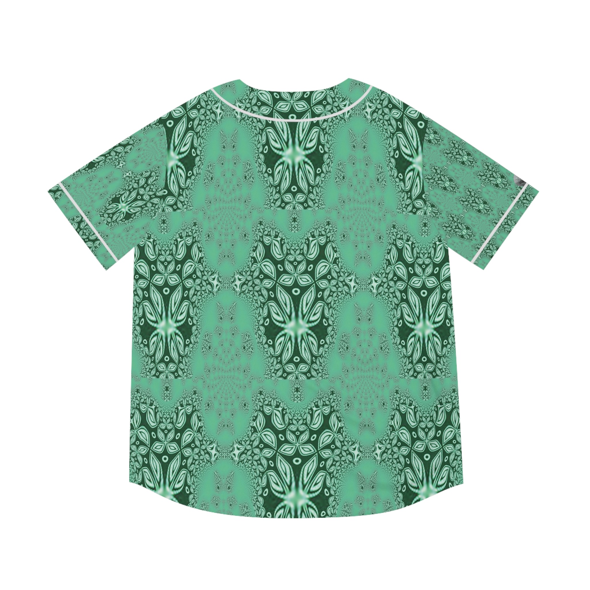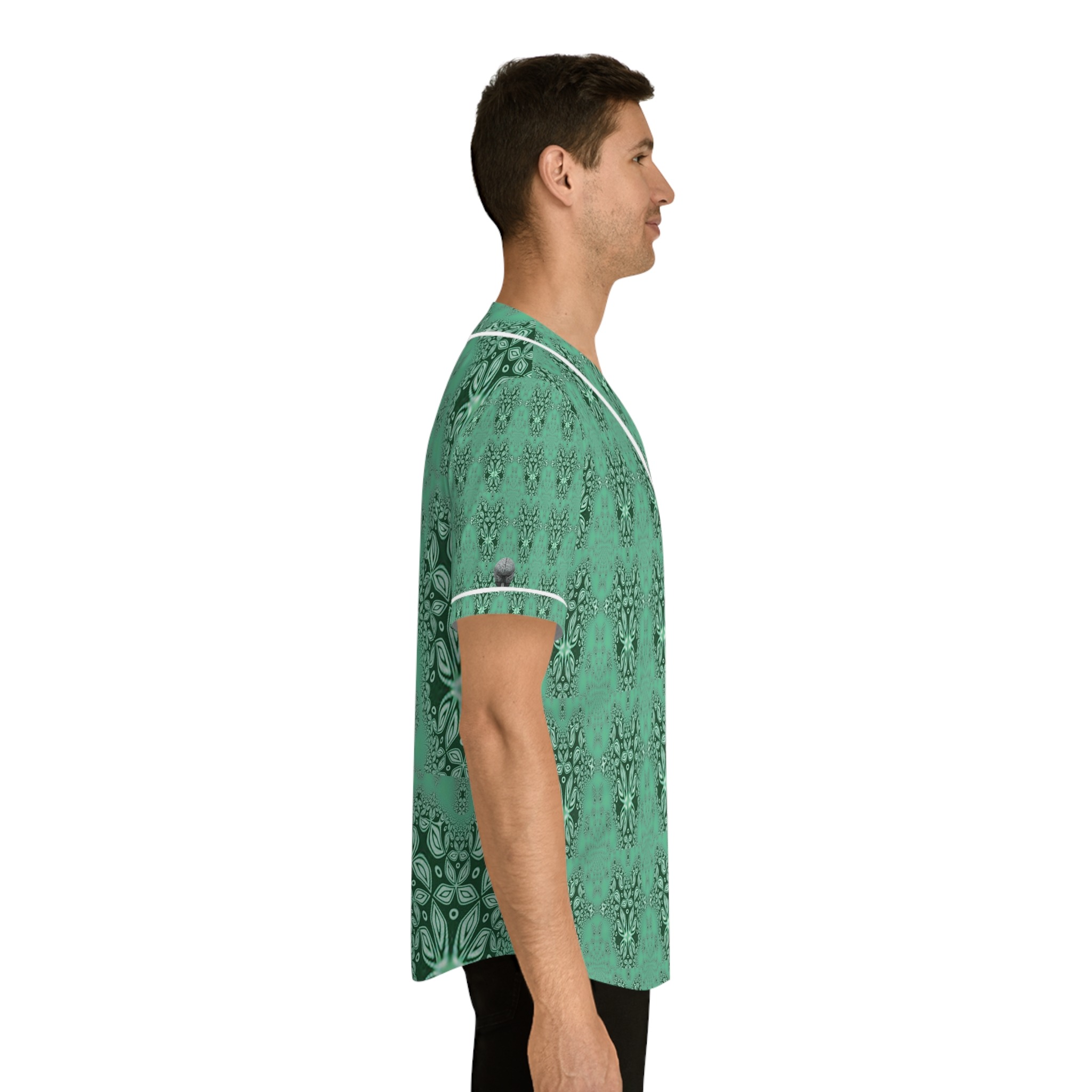 This lightweight baseball jersey brings vintage charm to active days. The all-over mint-green damask pattern reads like an heirloom textile reimagined for movement — ornate but soft, with subtle symmetry that catches the eye without shouting. The rounded hem and full-button front let it layer easily over tees or tanks. Breathable, moisture-wicking polyester keeps skin dry during long practices, errands, or warm-weather hangs. Choose black or white trim and buttons to dial the contrast up or down. Wear it to neighborhood games, weekend markets, or evenings at the skate park — it moves with you and keeps a quietly curated look.