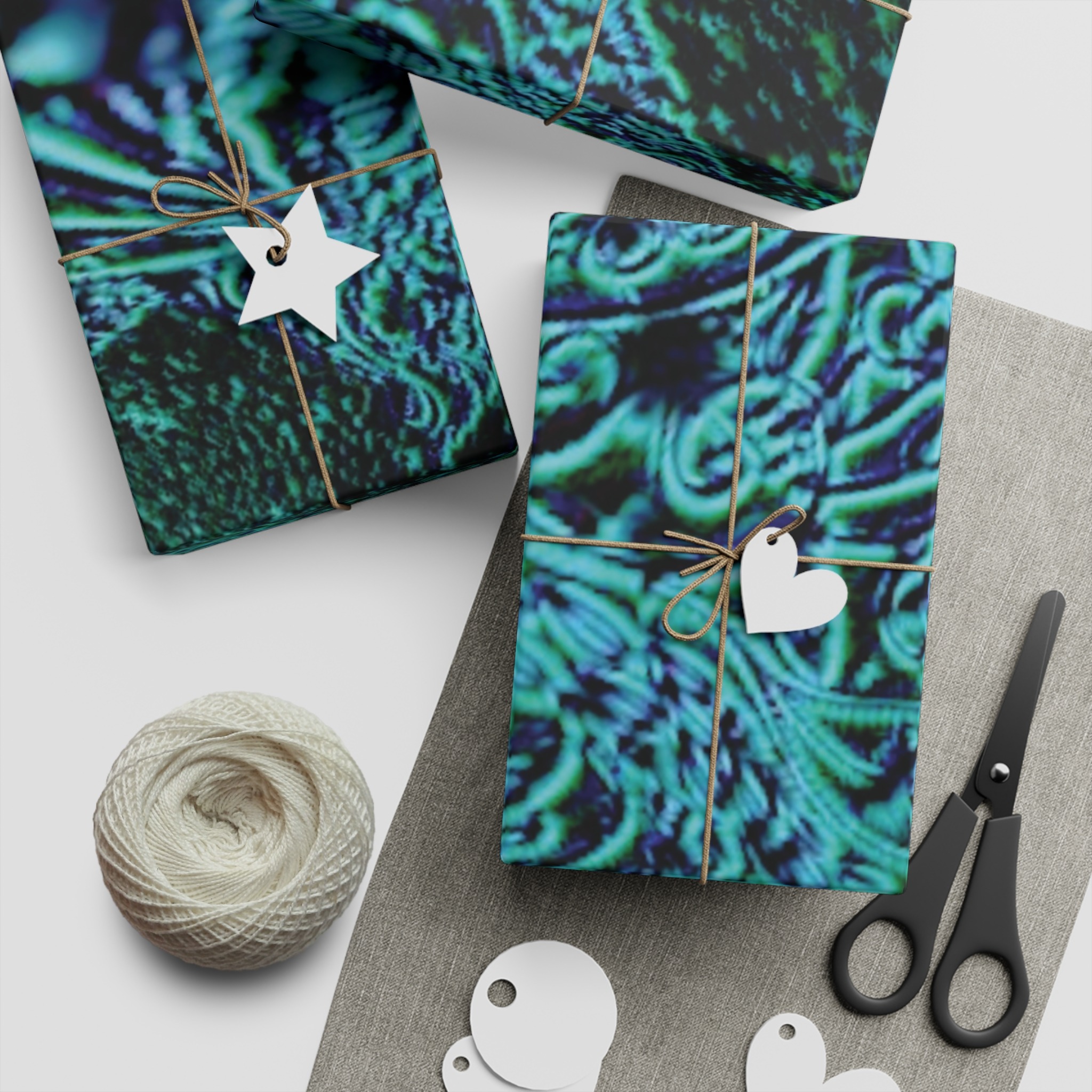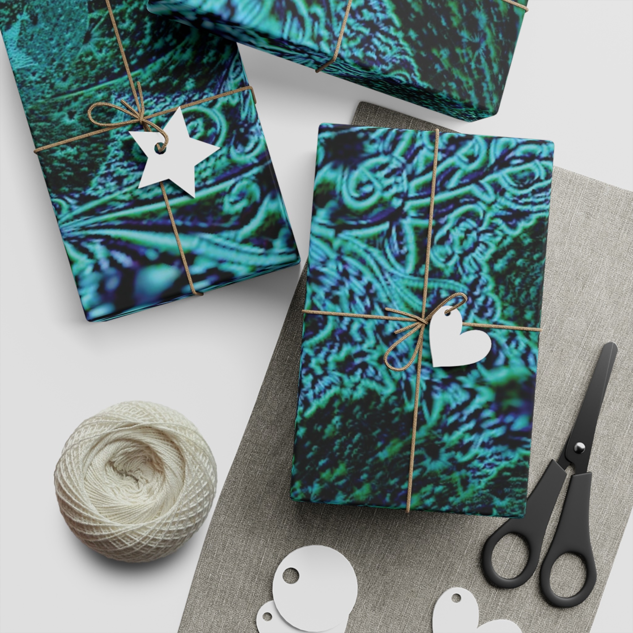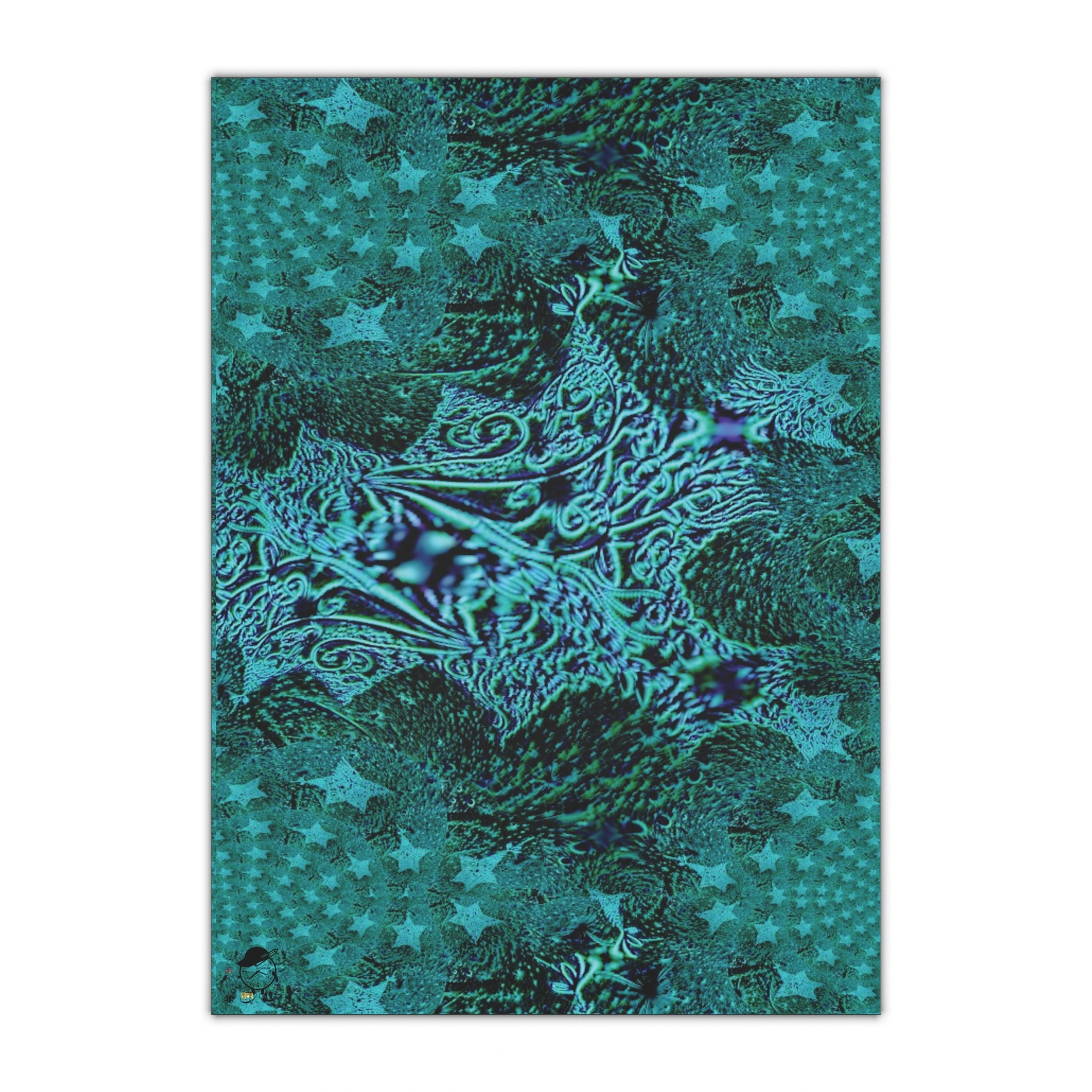 Deep teal swirls and textured stars come together in this richly detailed wrapping sheet to make each present feel cared for before it’s even opened. The satin surface catches light, letting the turquoise, navy and sea-green tones breathe and shift as hands move the paper while tying twine or adding a tag. It reads as both modern and slightly mystical — a subtle choice that elevates birthdays, holidays, or thoughtful surprise deliveries. Lightweight but sturdy, it folds crisply and holds creases for clean edges, so your wrapped gift looks intentional and considered.