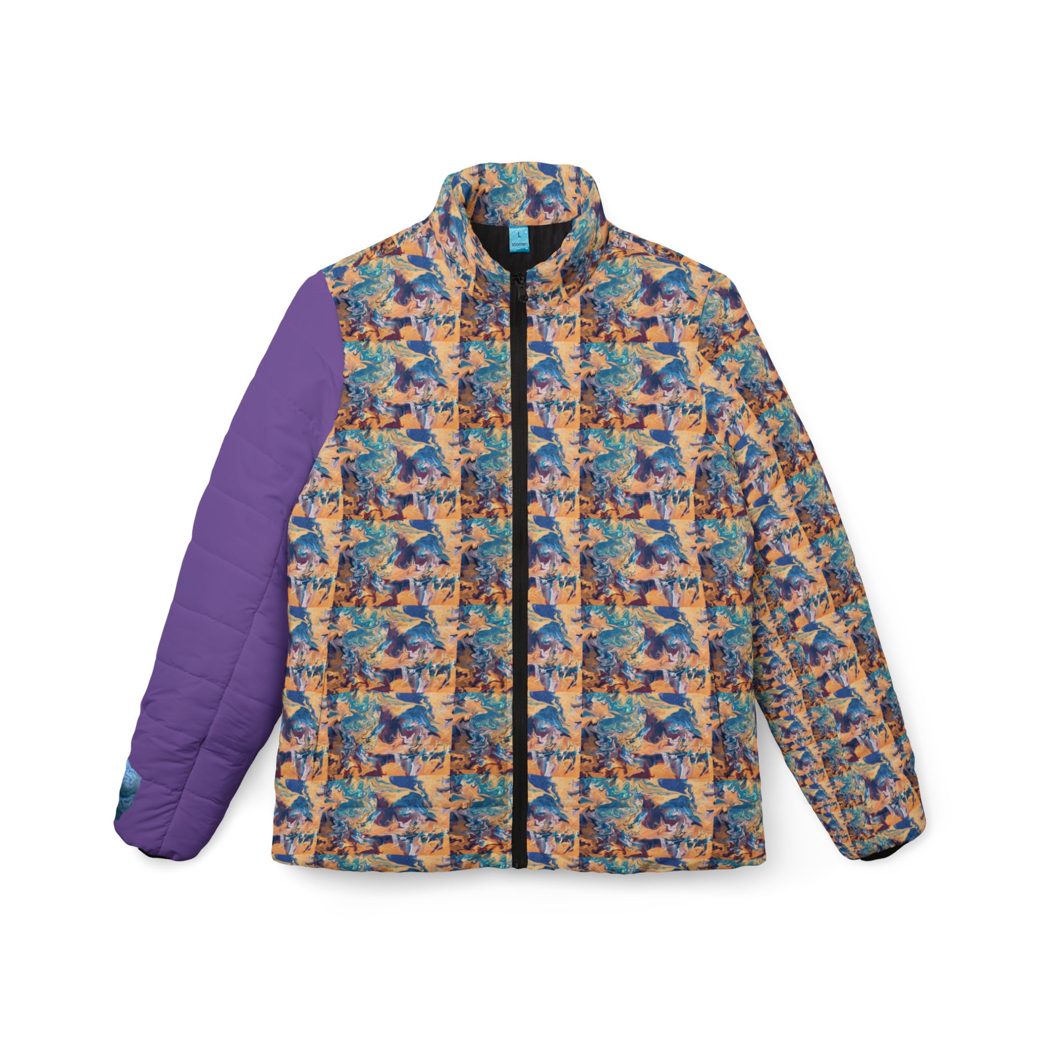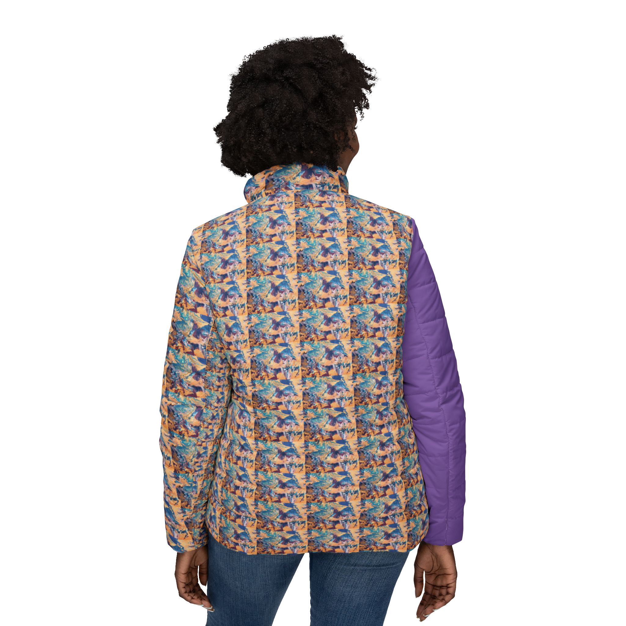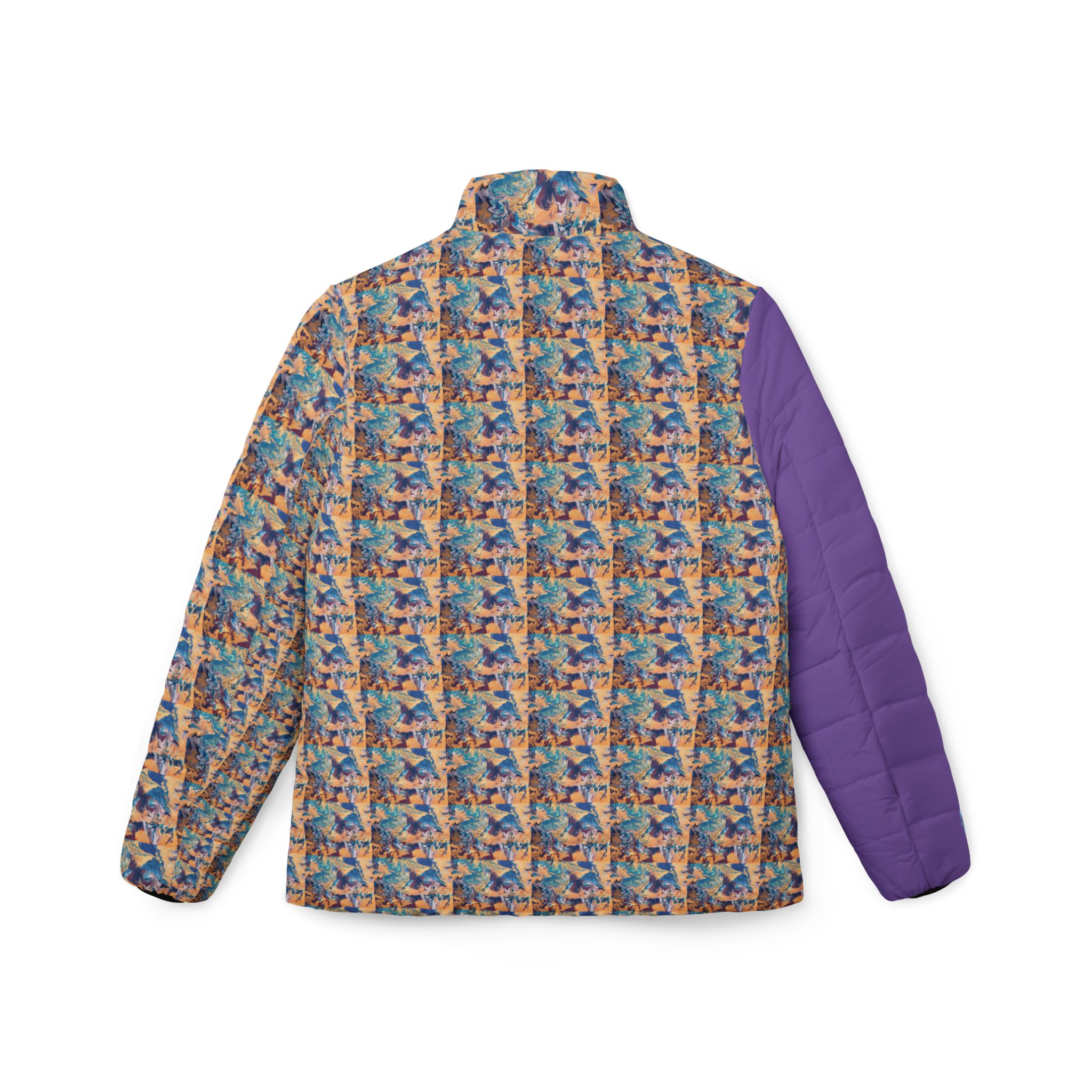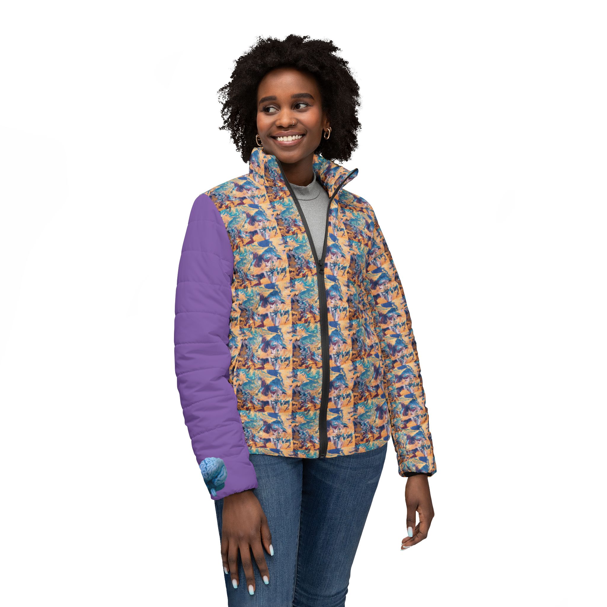 This lightweight puffer brings playful color and everyday warmth to chilly outings. Quilted padding and a full front zipper lock in coziness without bulk, while slanted self-lined pockets keep hands warm and small essentials close. The all-over printed body carries a lively, painterly repeat that feels creative and bright; one solid-colored sleeve adds an unexpected, modern twist. It layers easily over sweaters for neighborhood walks, creative commutes, or weekend gallery visits — made to move with you and hold its color through seasons.