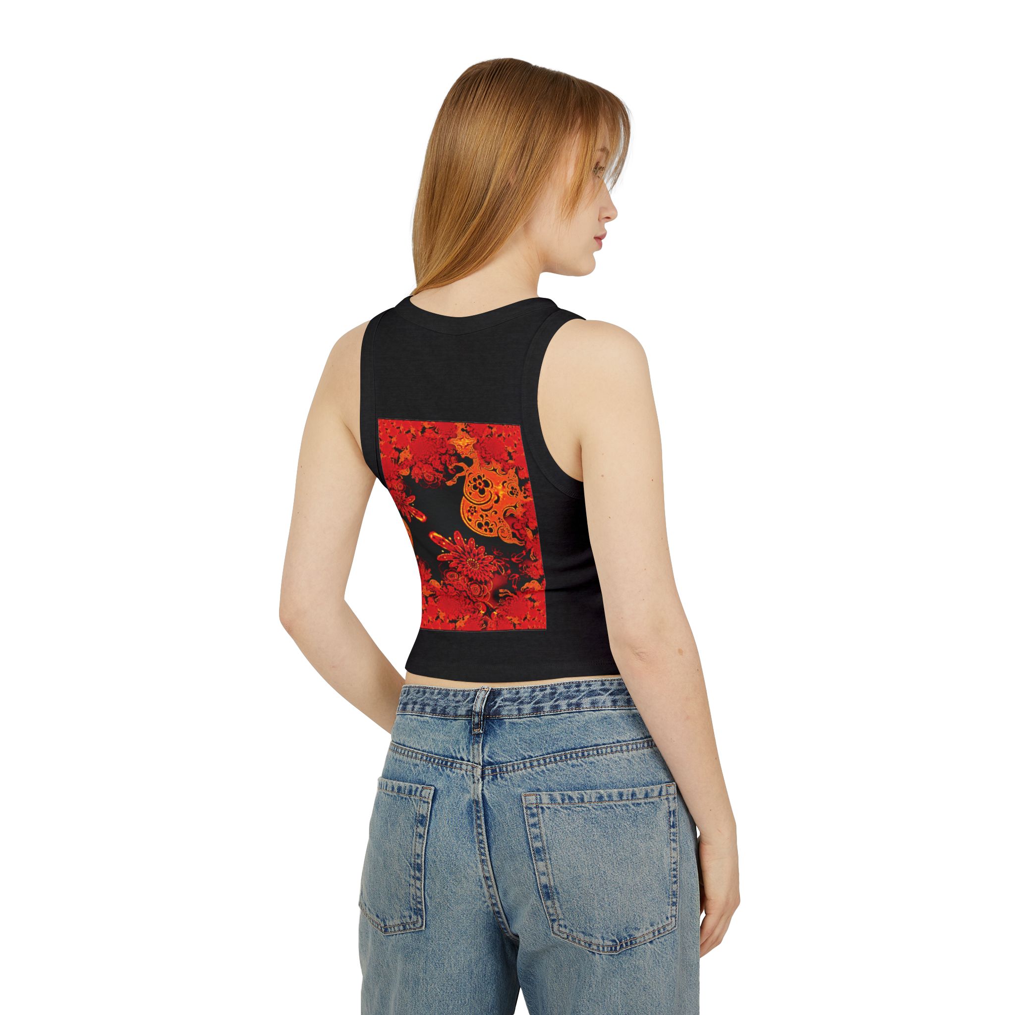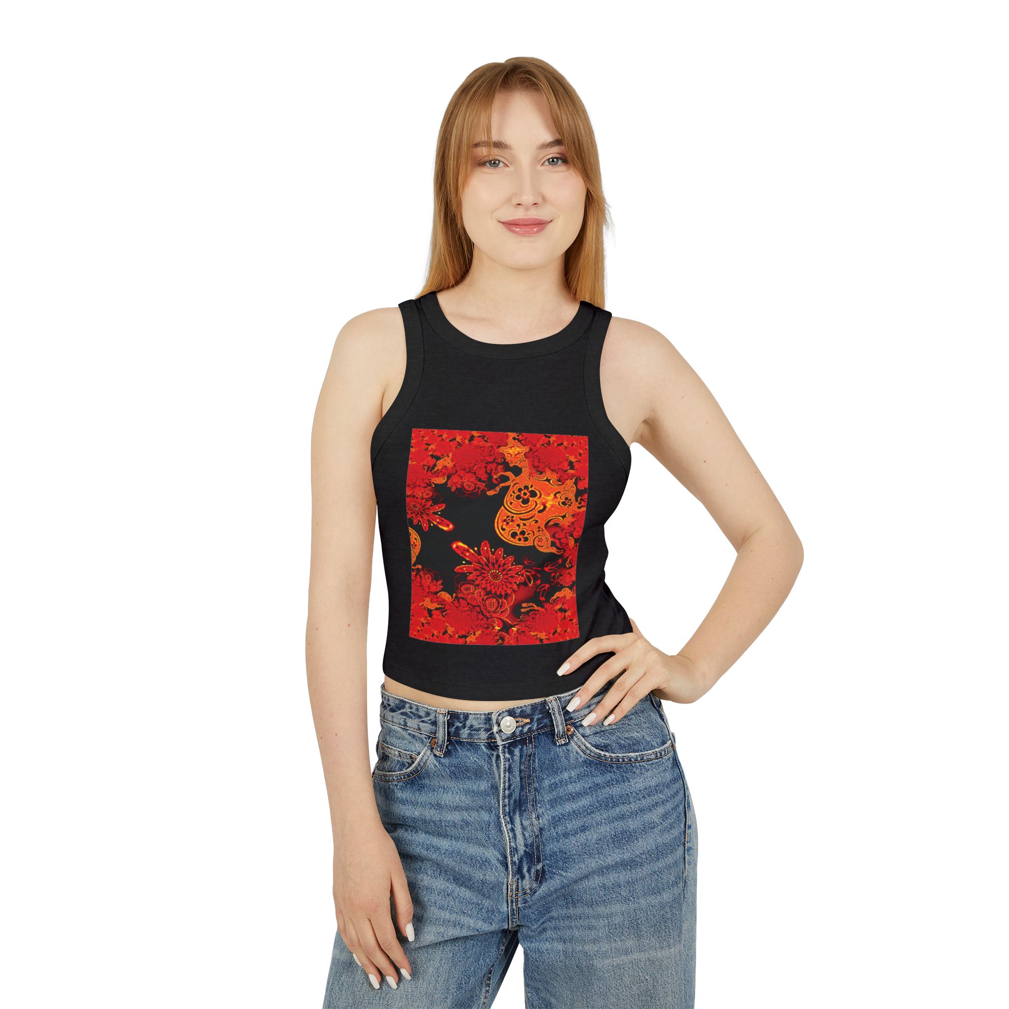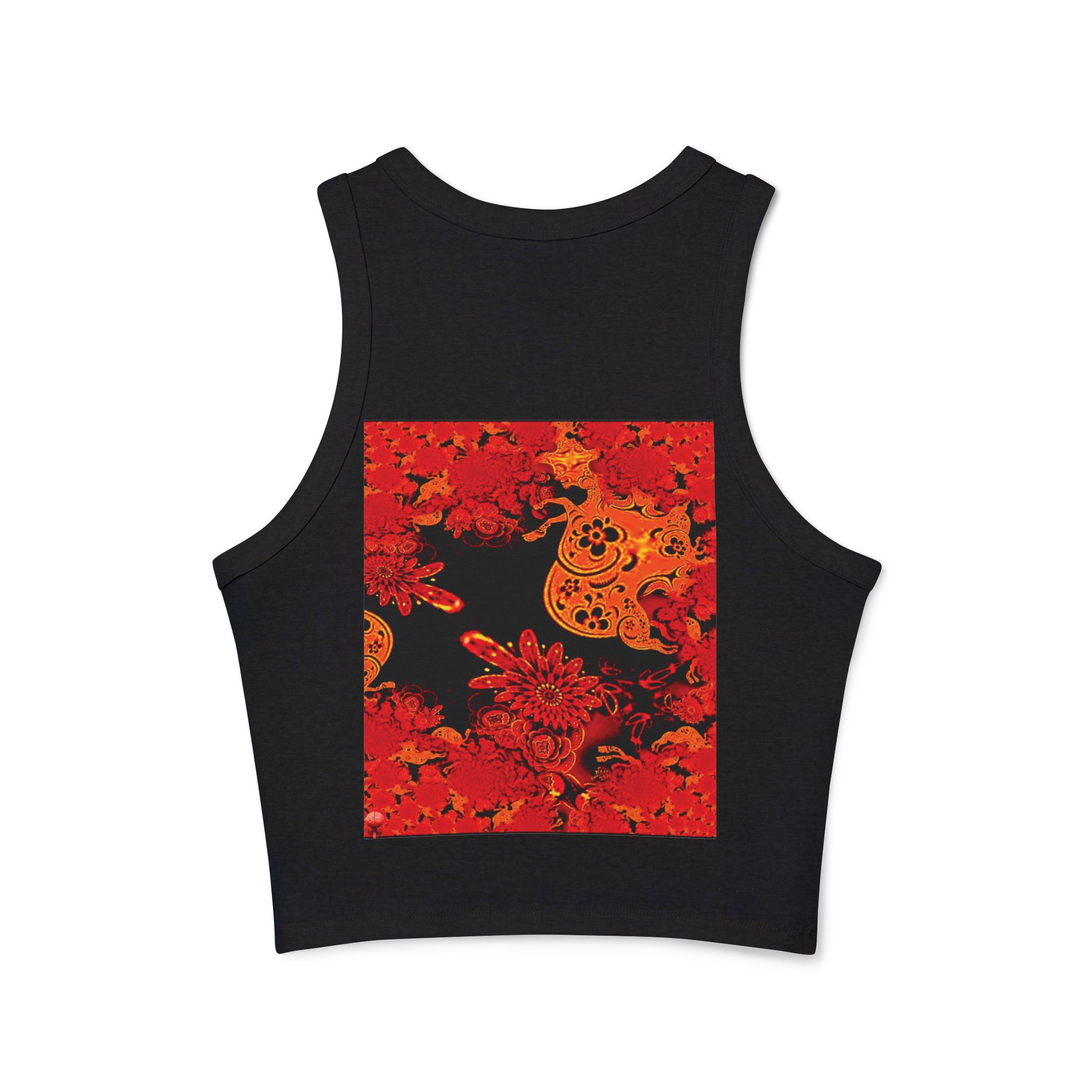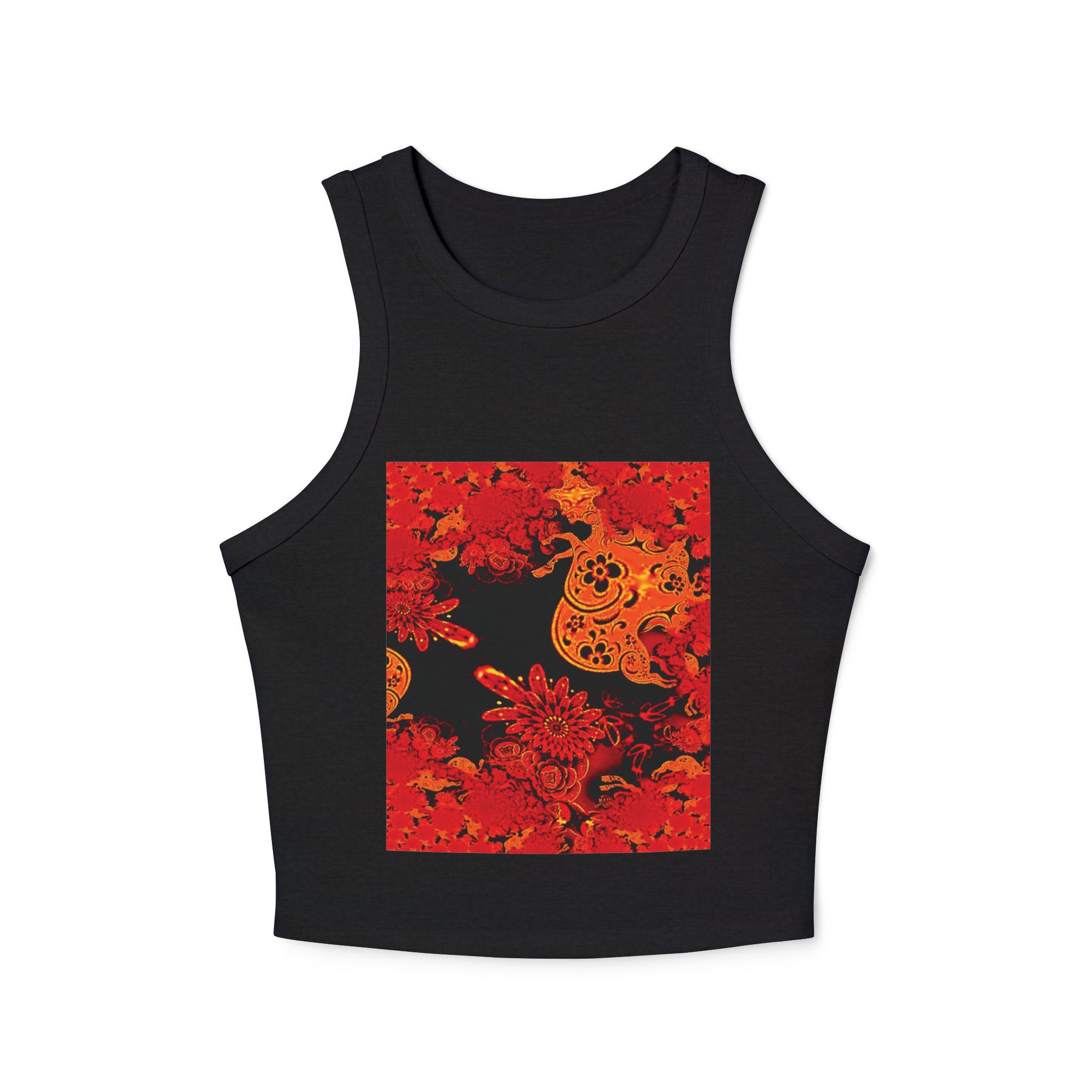 This micro rib racer tank brings bold, artful energy to everyday wear. Lightweight and fitted, it sits mid-length and hugs the silhouette with a high neck that reads modern and confident. The rich, painterly floral panel—burnt oranges and deep reds against black—feels like a vintage textile rediscovered and stitched into contemporary streetwear. Wear it layered under an open shirt or alone on warm days; the stretch micro rib moves with you and the soft Airlume-combed cotton blend keeps the surface smooth and breathable. The printed panel uses DTF for vivid, lasting color so the design stays lively wash after wash. Small details like the tear-away label and tailored fit make it comfortable enough for everyday rotation, while the statement print makes it a standout in your closet.